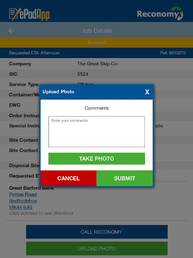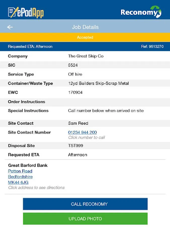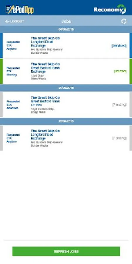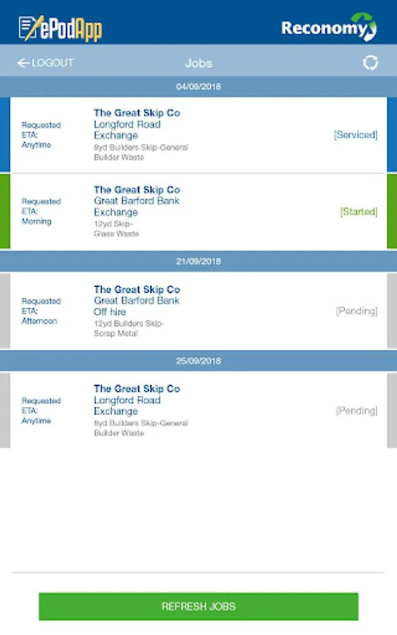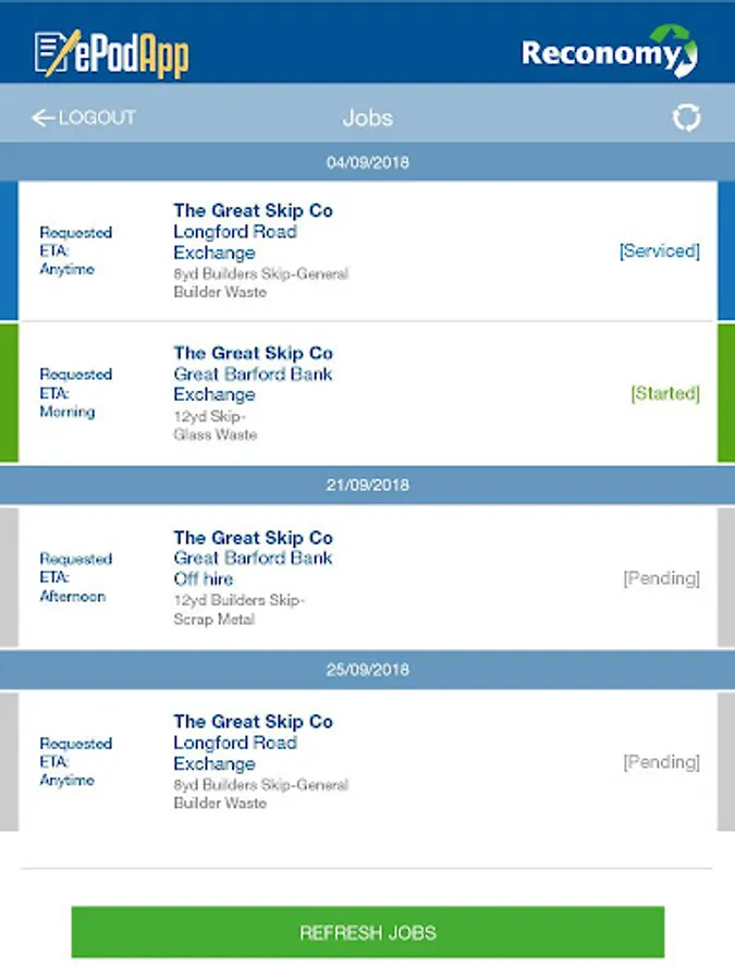 The Reconomy ePod App enables drivers to provide updates on individual jobs as and when their status changes, which can be viewed by both your office staff and Reconomy in real-time.