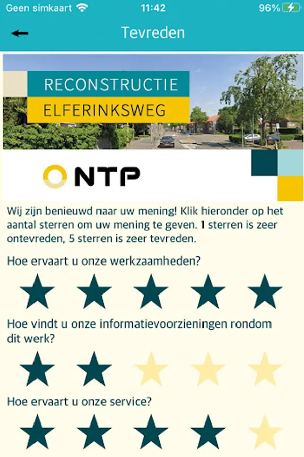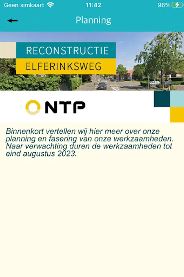 In this app you will find all information about the work of the project 'Reconstruction Elferinksweg' of NTP. Important project information, the latest schedule and contact information are displayed . You can also leave questions, comments or complaints related to the project on this app.