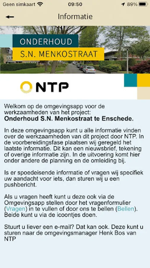 In this app you will find all information about the work of the 'Maintenance S.N.' project. Menkostraat' from NTP. Important project information, the latest schedule and contact information are displayed. You can also leave questions, comments or complaints related to the project on this app.