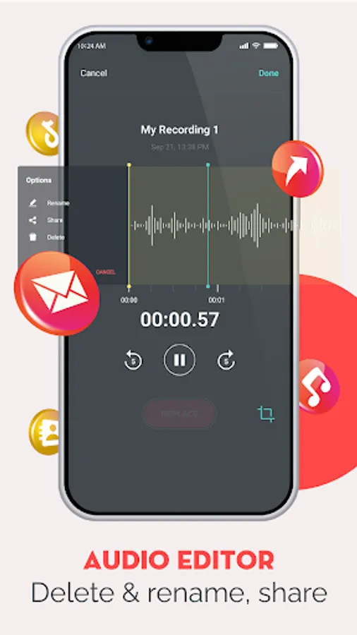 Voice recorder and cutter - simple and reliable. Start the professional sounds recording app and you are good to go! Press the striking Red button, you'll immediately start recording. Hope the voice editor for recording app is helpful for you. If you have any question about smart voice recorder app, leave a comment below or contact us.