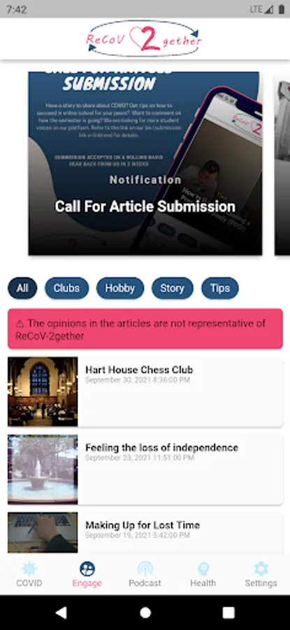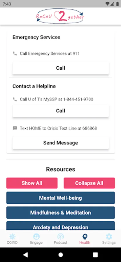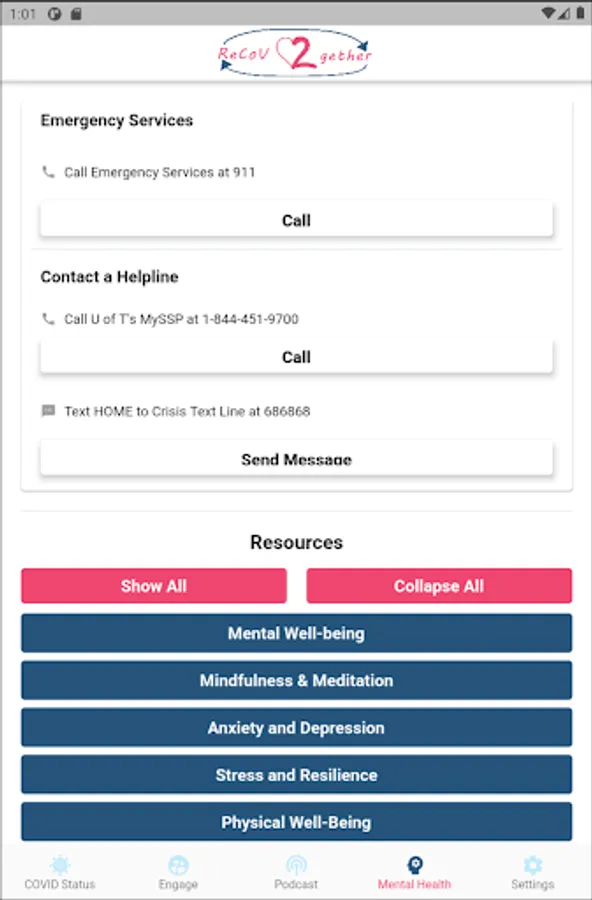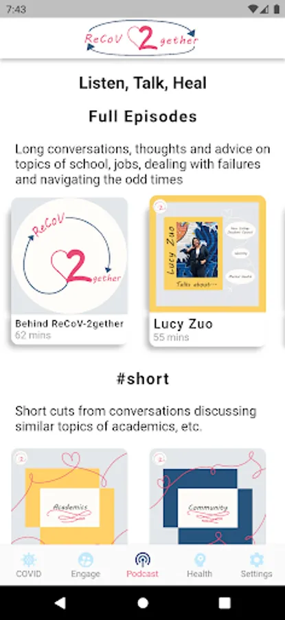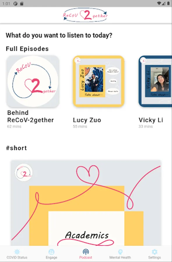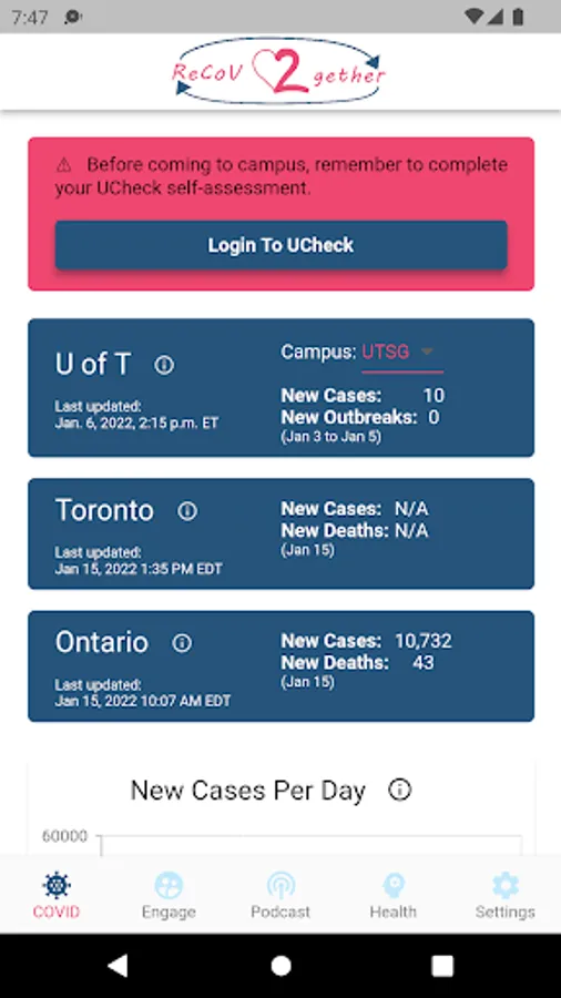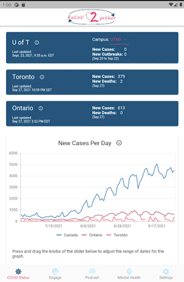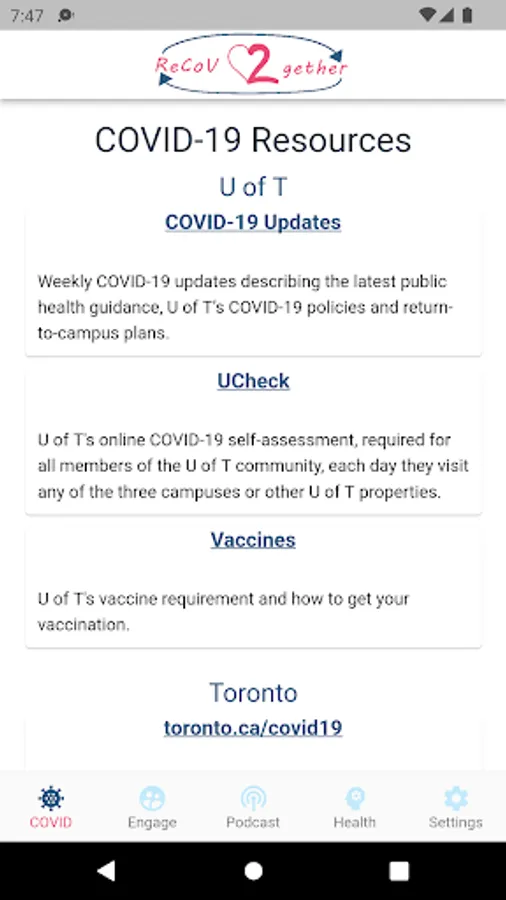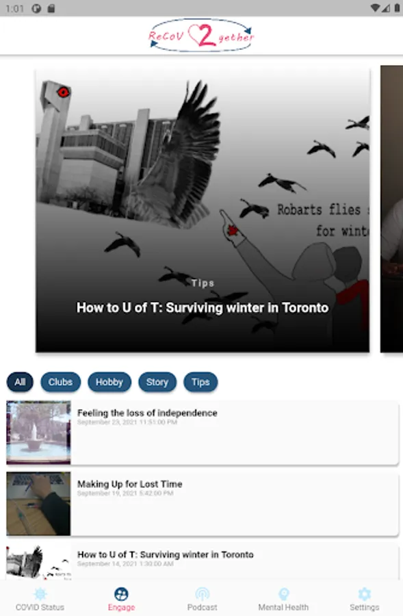ReCoV-2gether is an app created by 5 University of Toronto students and alumni funded by the U of T Student Engagement Award aiming to promote student engagement and community rebuild after campus reopening. It has functionalities including a podcast called Listen, Talk, Heal, a COVID-19 tracker, mental health resources, as well as ways for students to get involved, whether you’re on- or off-campus.