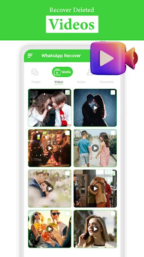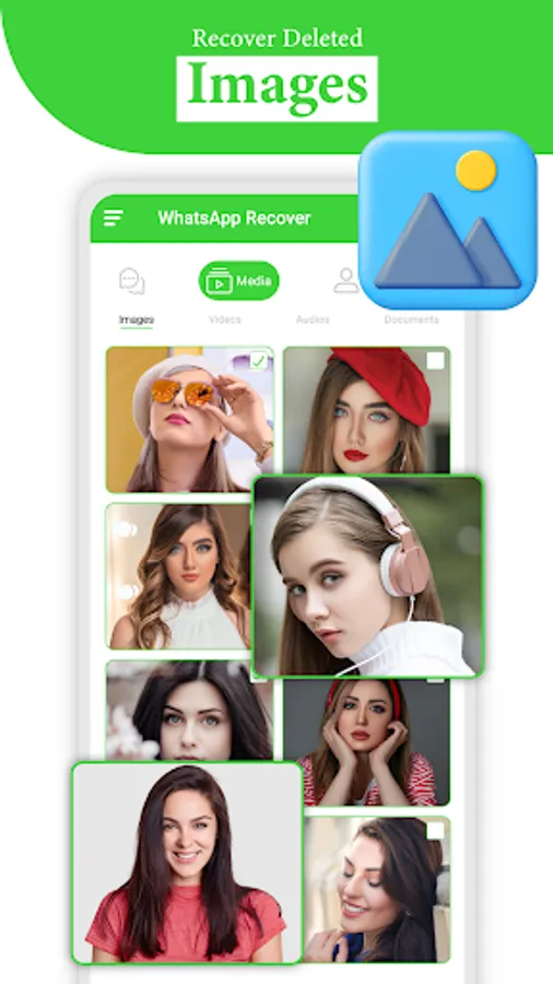 Recover deleted Photos, Deleted Video recovery, Animated Gifs, Audio, Voice notes, Documents, Stickers