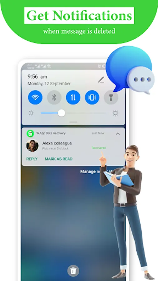 Here’s how it works: WhatsApp Message recovery app can’t directly access the messages on your device because they are encrypted. So, WMR WA recover reads the notification you receive, and creates a backup based on that. When the WAMR Recovery app detects a deleted message, Recover Deleted Messages WA notifies you right away!