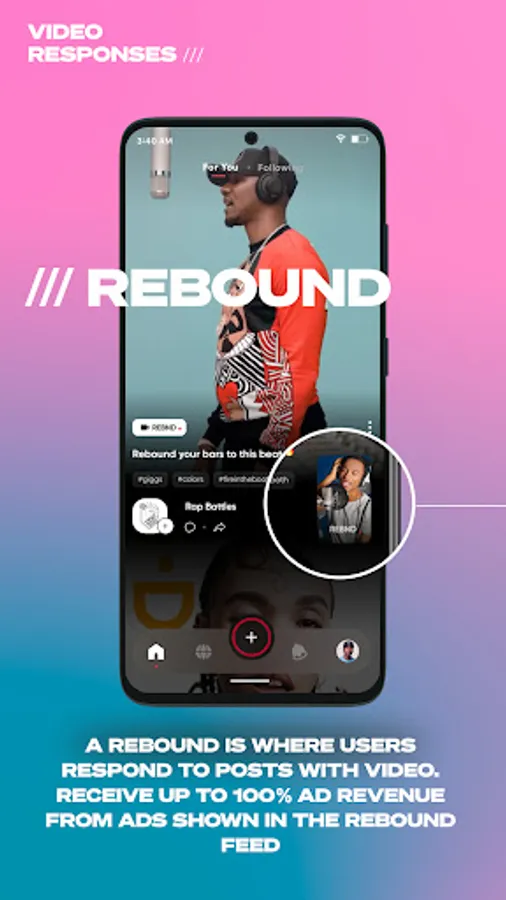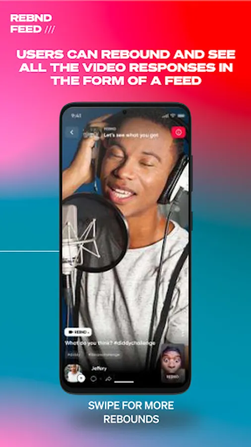 A rebound is a new way to engage video. similar to a like, or a share, but in this case, the engagement is a video response. This could be a thought, a reaction or a remix of the original video, users can watch all rebounds in single feed.