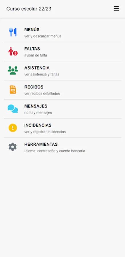 In it you will be able to manage in an agile and simple way all the information referring to the assistance of the student, the menus, financial information, així with a line of direct communication of incidents and missatges with the company.