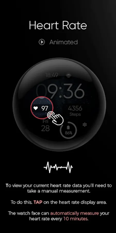 To view your current heart rate data you’ll need to take a manual measurement. To do this, TAP on the heart rate display area. The watch face can automatically measure your heart rate every 10 minutes.