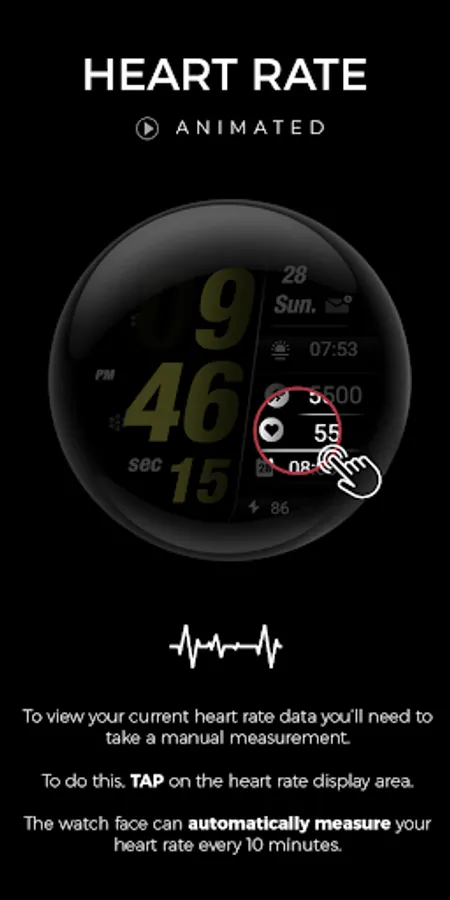 To view your current heart rate data you’ll need to take a manual measurement. To do this, TAP on the heart rate display area. The watch face can automatically measure your heart rate every 10 minutes.