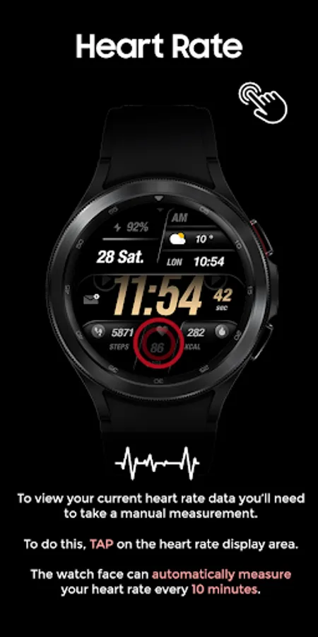 To view your current heart rate data you’ll need to take a manual measurement. To do this, TAP on the heart rate display area. The watch face can automatically measure your heart rate every 10 minutes.