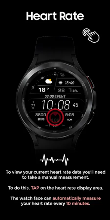 To view your current heart rate data you’ll need to take a manual measurement. To do this, TAP on the heart rate display area. The watch face can automatically measure your heart rate every 10 minutes.