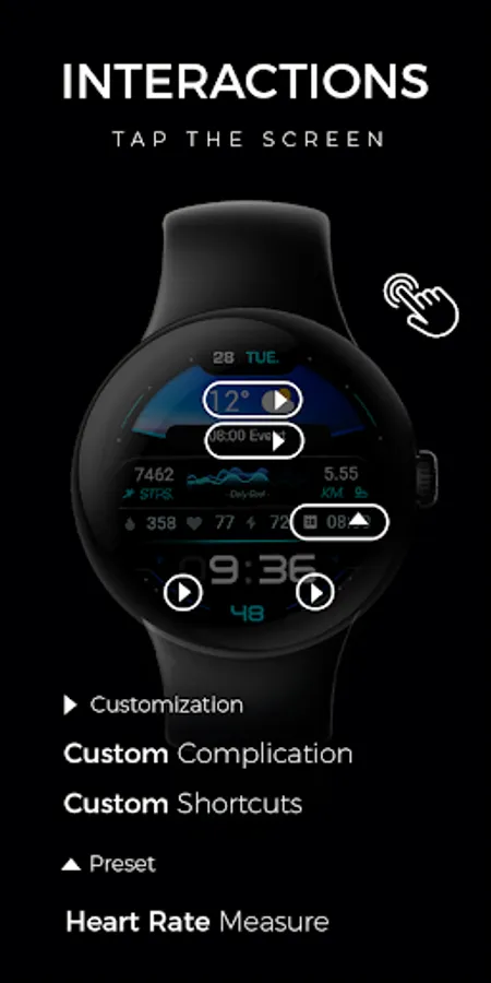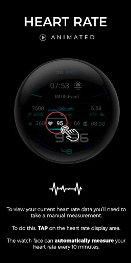 To view your current heart rate data you’ll need to take a manual measurement. To do this, TAP on the heart rate display area. The watch face can automatically measure your heart rate every 10 minutes.