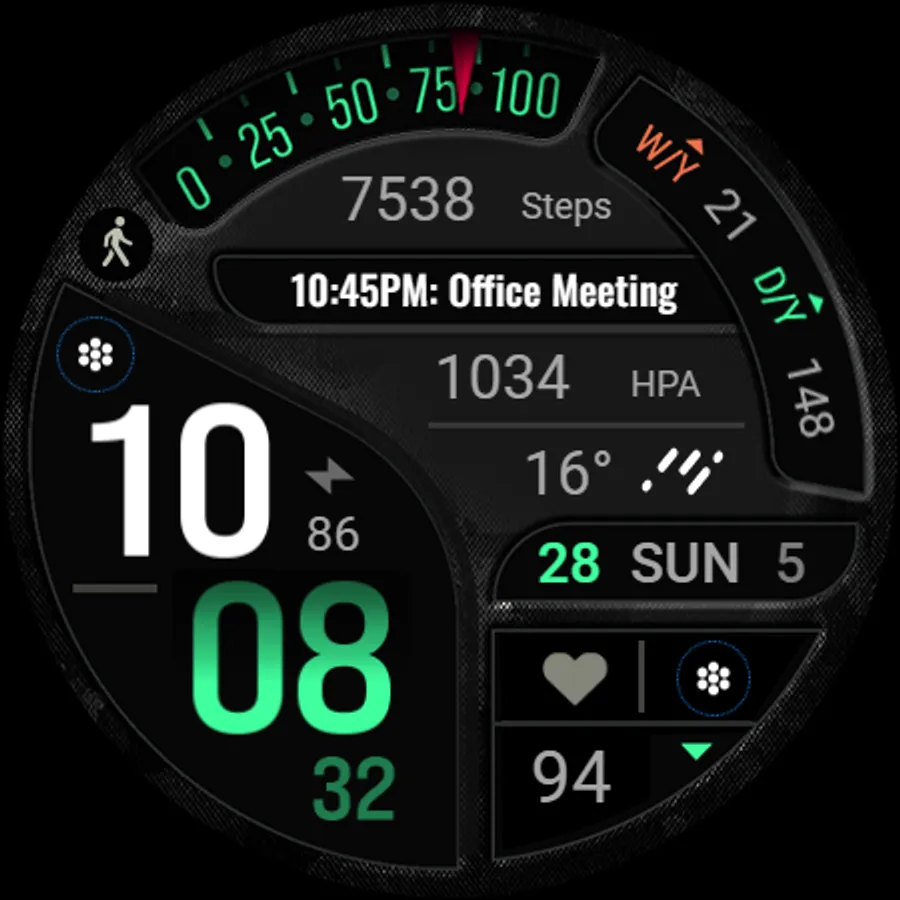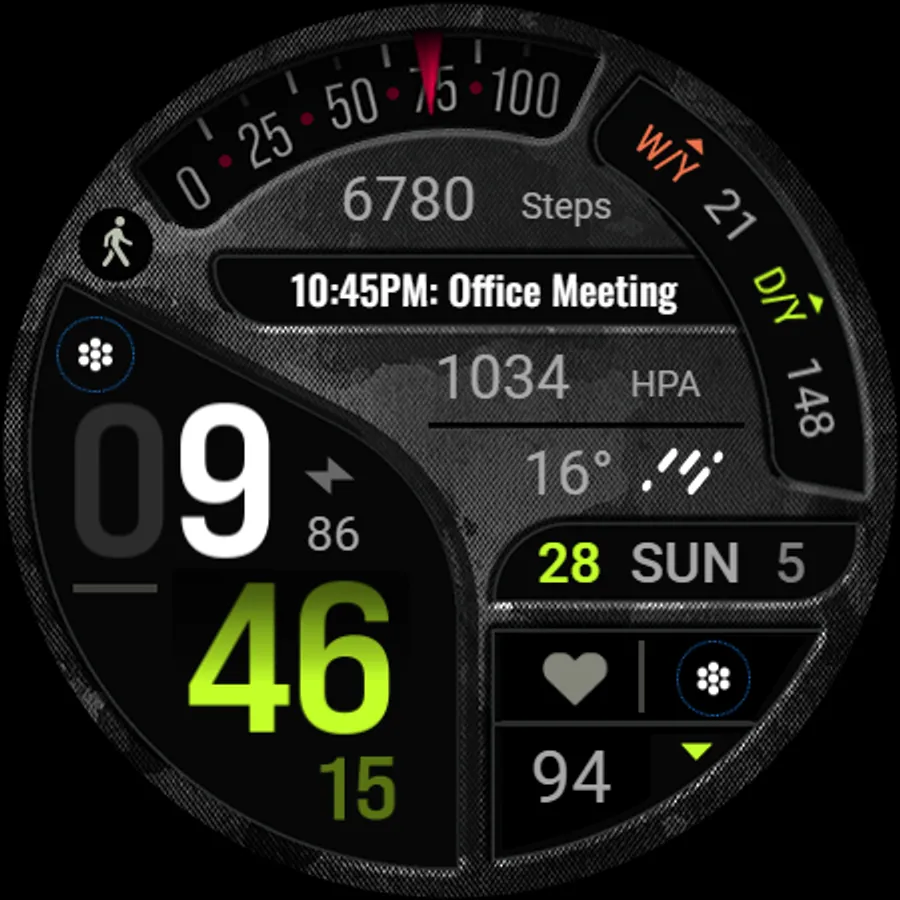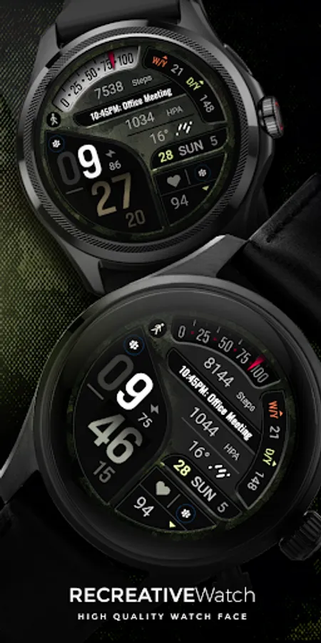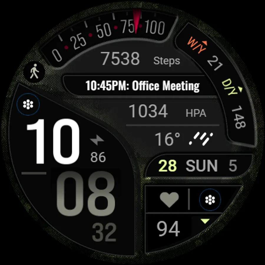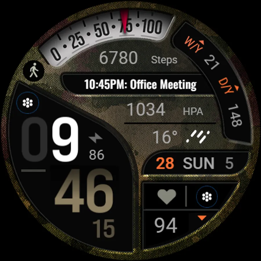 If you've always been fond of objects that mimic military or army attire, this watch face is perfect for you. It features a masculine style that encompasses various customizations, textures, and camouflage patterns that imitate the colors of nature.