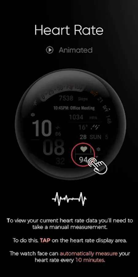 To view your current heart rate data you’ll need to take a manual measurement. To do this, TAP on the heart rate display area. The watch face can automatically measure your heart rate every 10 minutes.