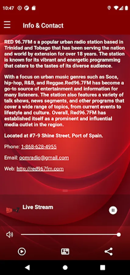 RED 96.7FM s a popular urban radio station based in Trinidad and Tobago that has been serving the nation and world by extension for over 18 years. The station is known for its vibrant and energetic programming that caters to the tastes of its diverse audience.