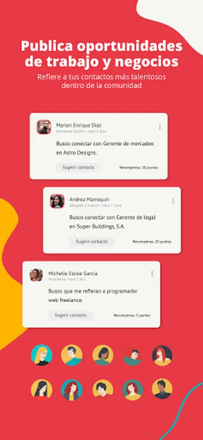 Contact suggestions: Looking for a specific profile? set the characteristics and discover the top 3 profiles of your friends network and connect with them with a simple tap.