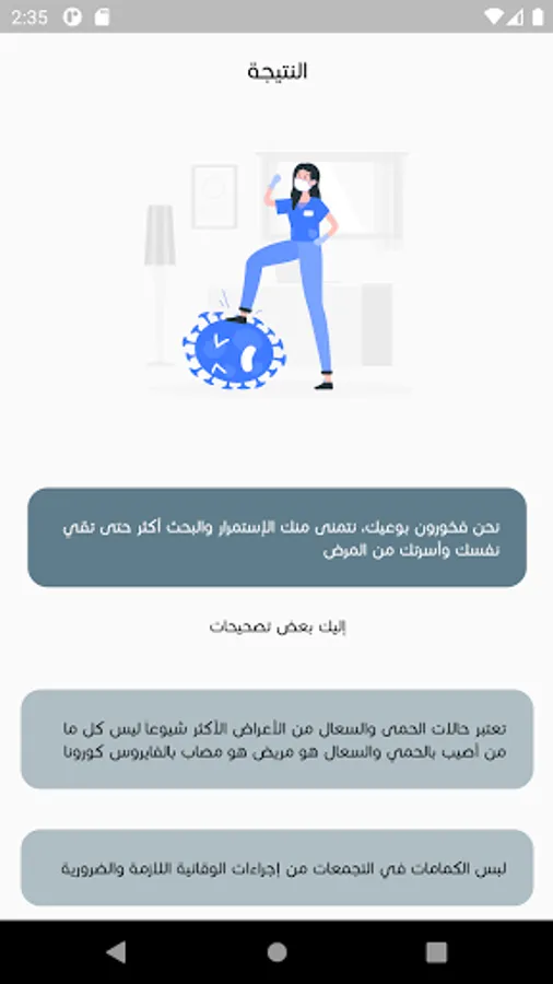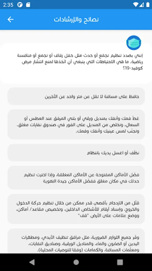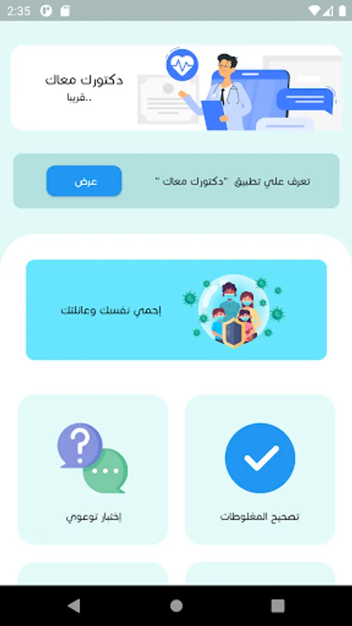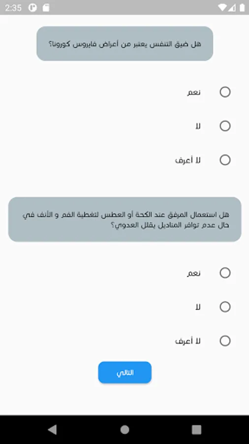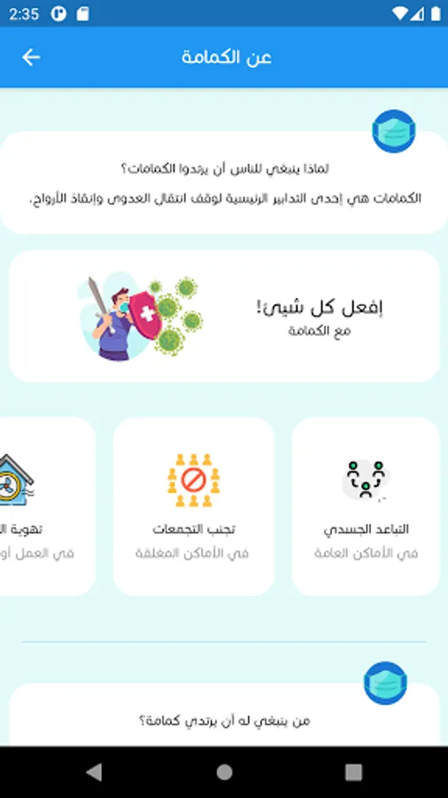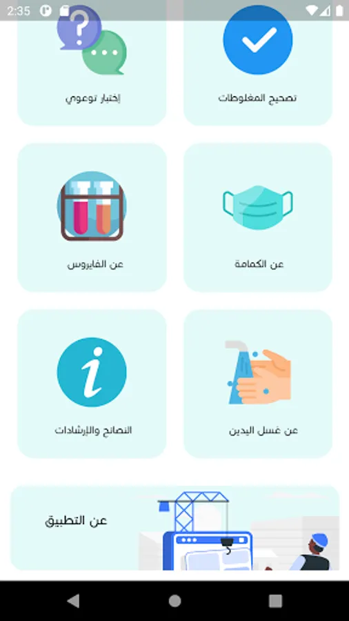 all information In "Talab Info" app has taken from the official website of the World Health Organization (https://www.who.int/ar) starting from how to self, know the important role of mask in protecting, and how to wash hands. The app provide a short local questionnaire of awareness. Also, app provides advises for self protection and correcting some wrong information about some cases.