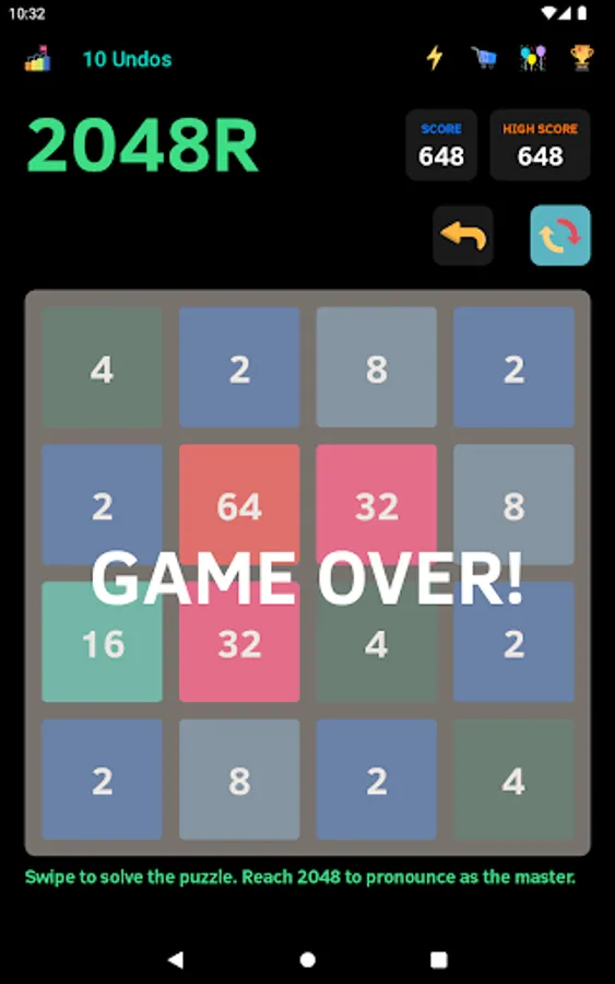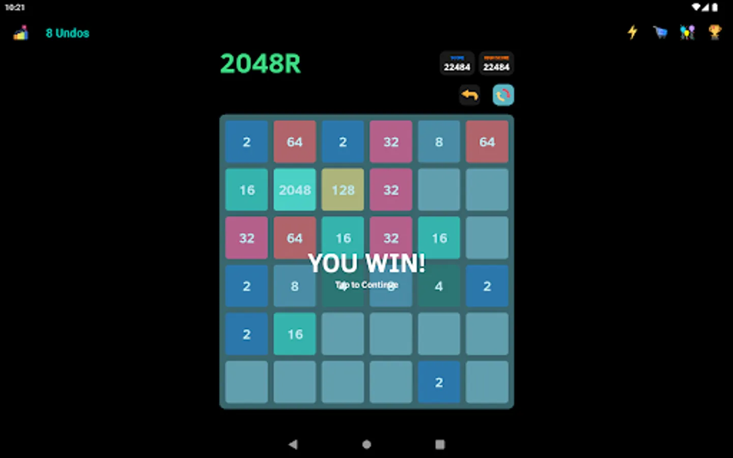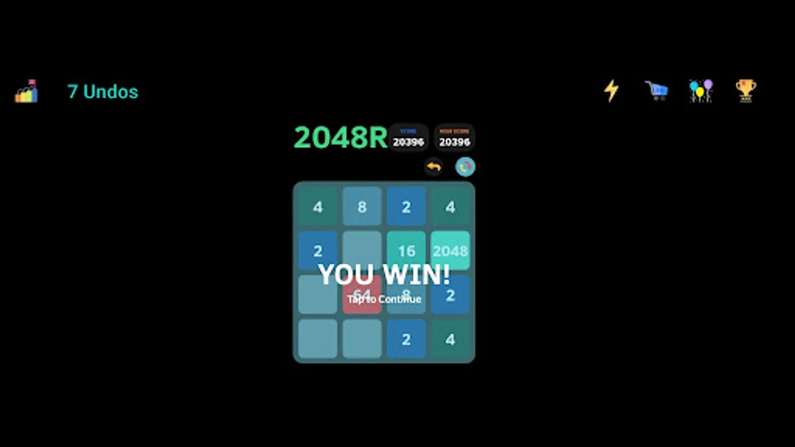 Swipe (Up, Down, Left or Right) to move the tiles. When two tiles with the same number touch, they merge into one. When 2048 tile is created, the player wins! 8 .. 16 .. 128 .. 1024 .. 2048.