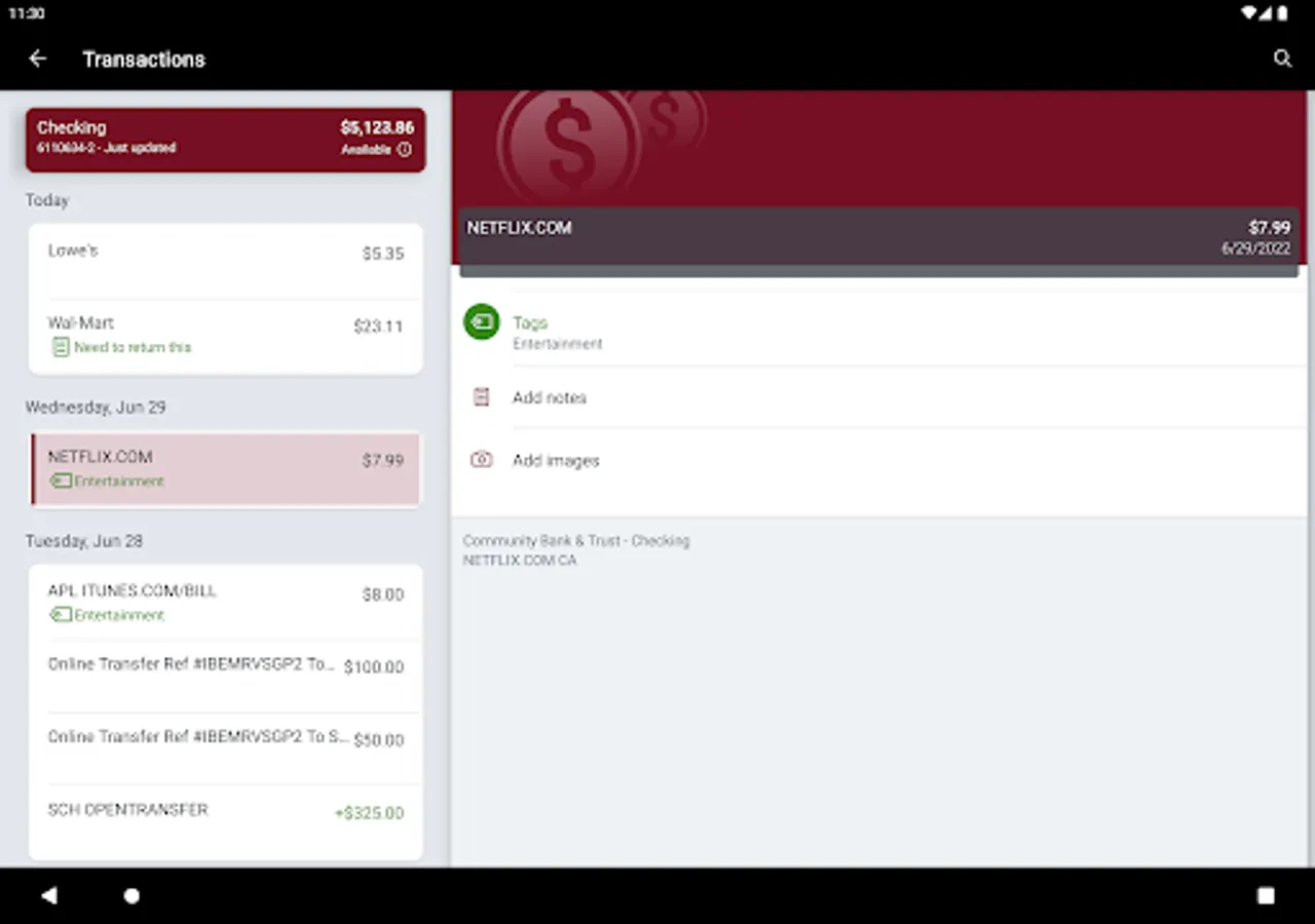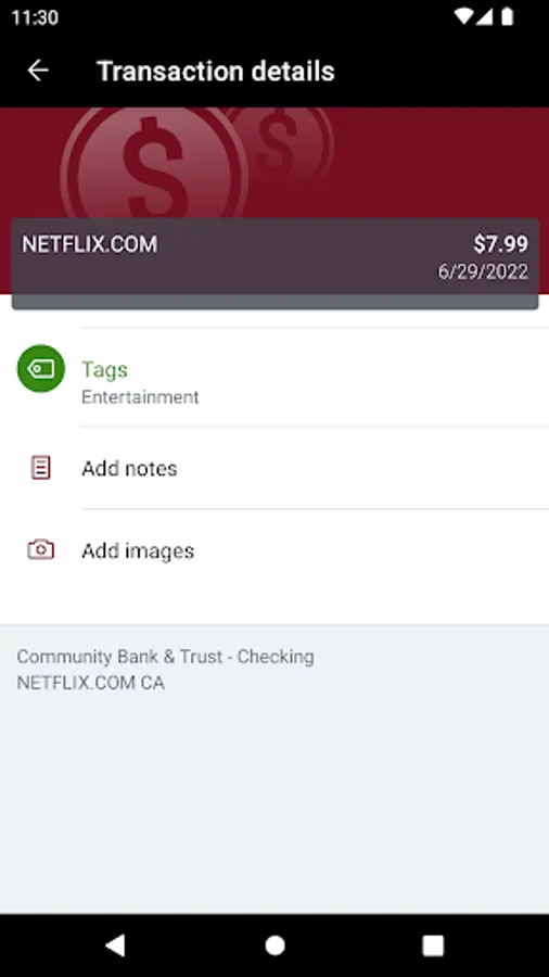 • Keep your transactions organized by allowing you to add tags, notes and photos of receipts and checks.