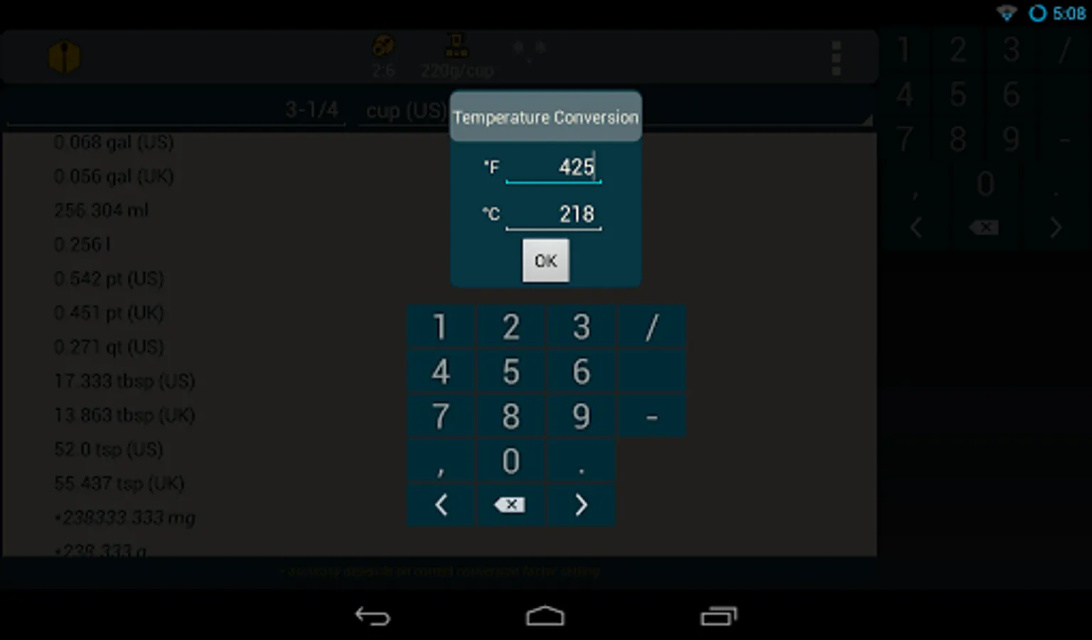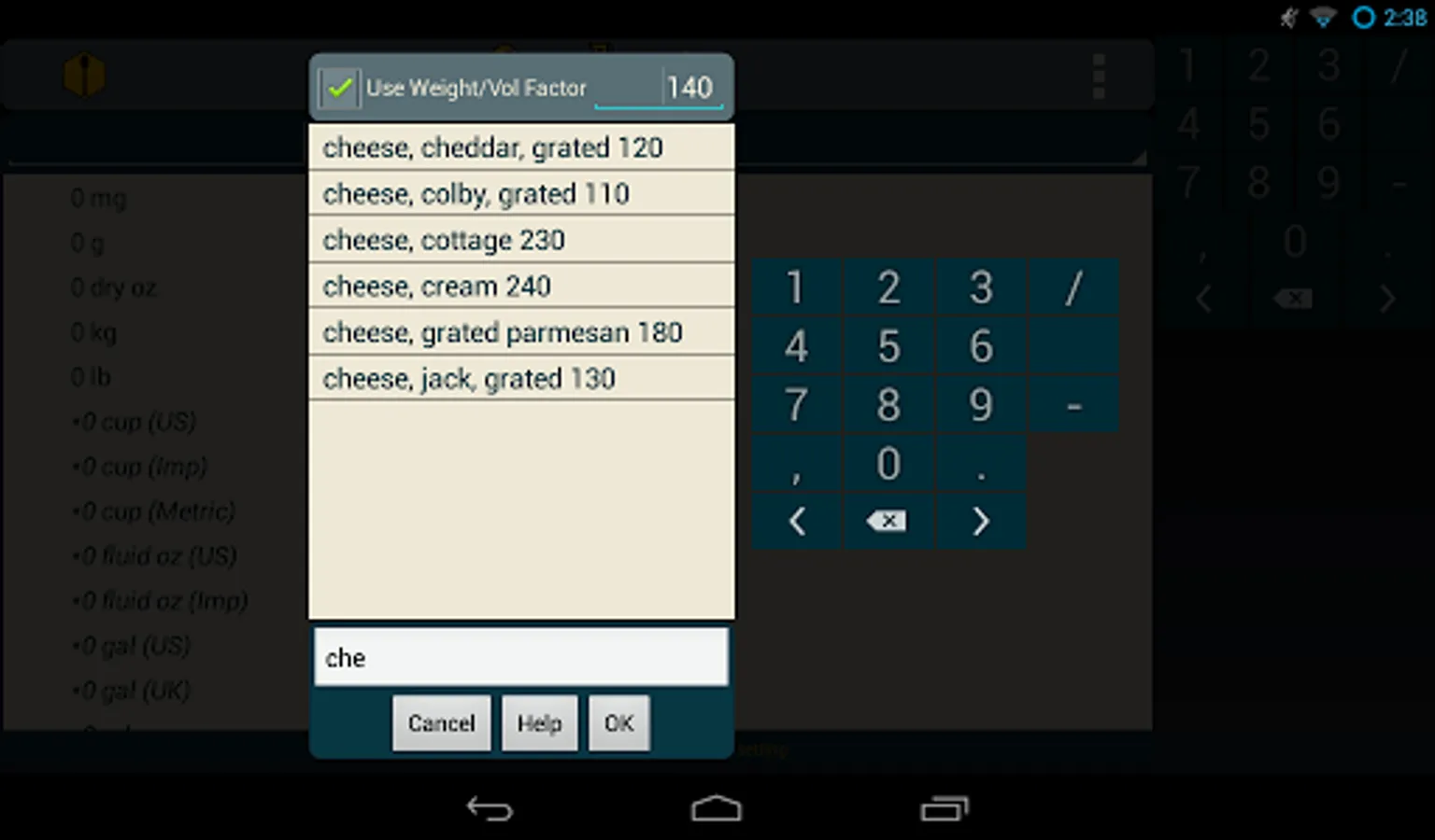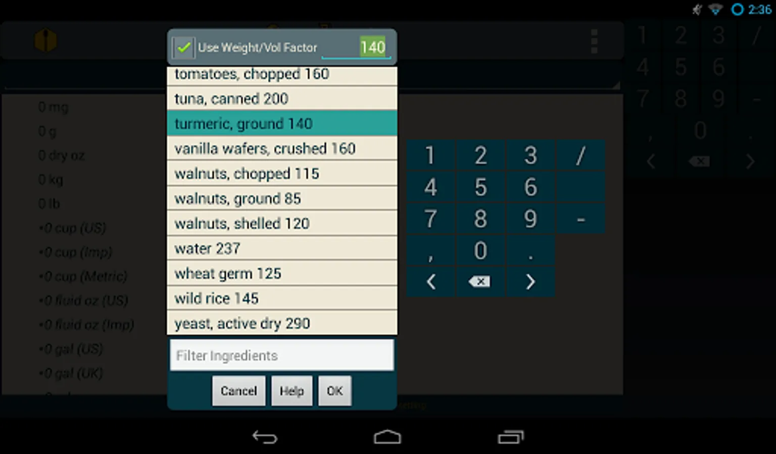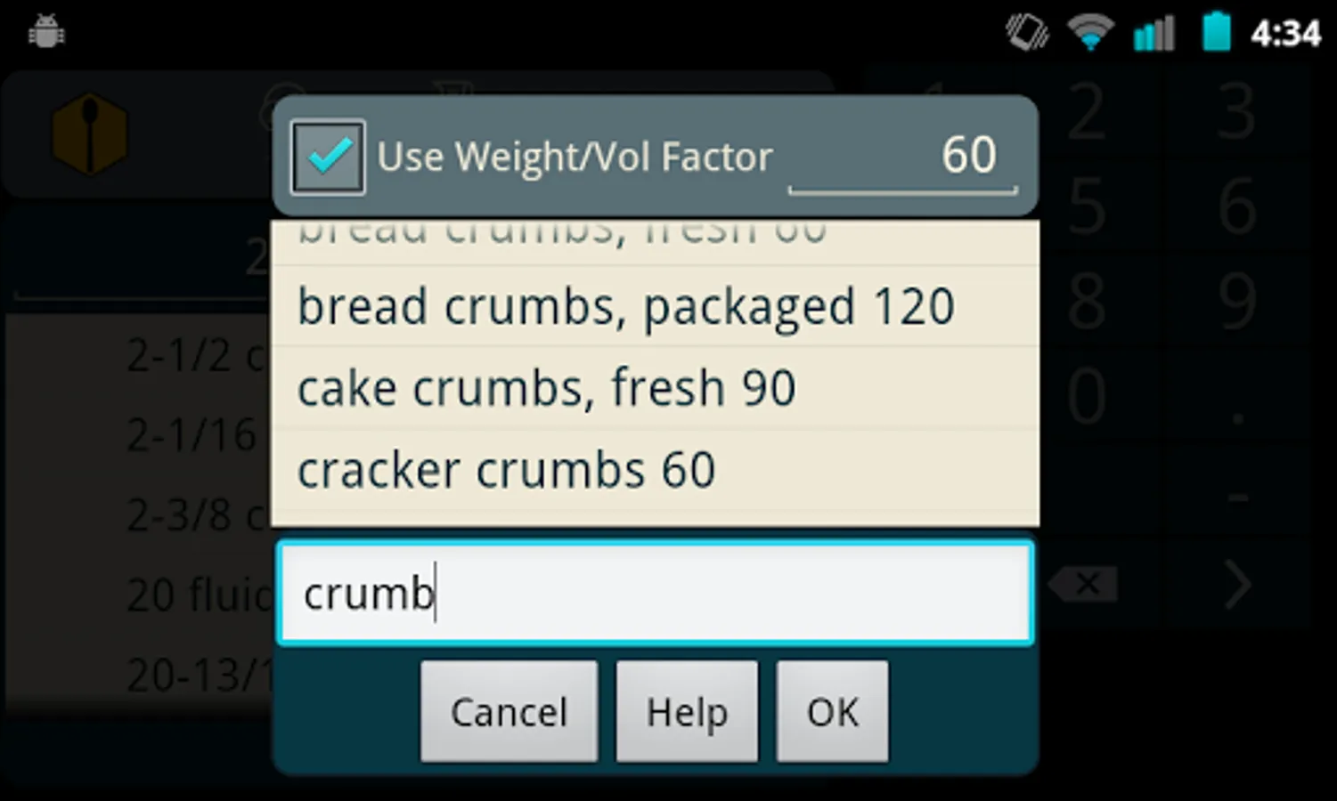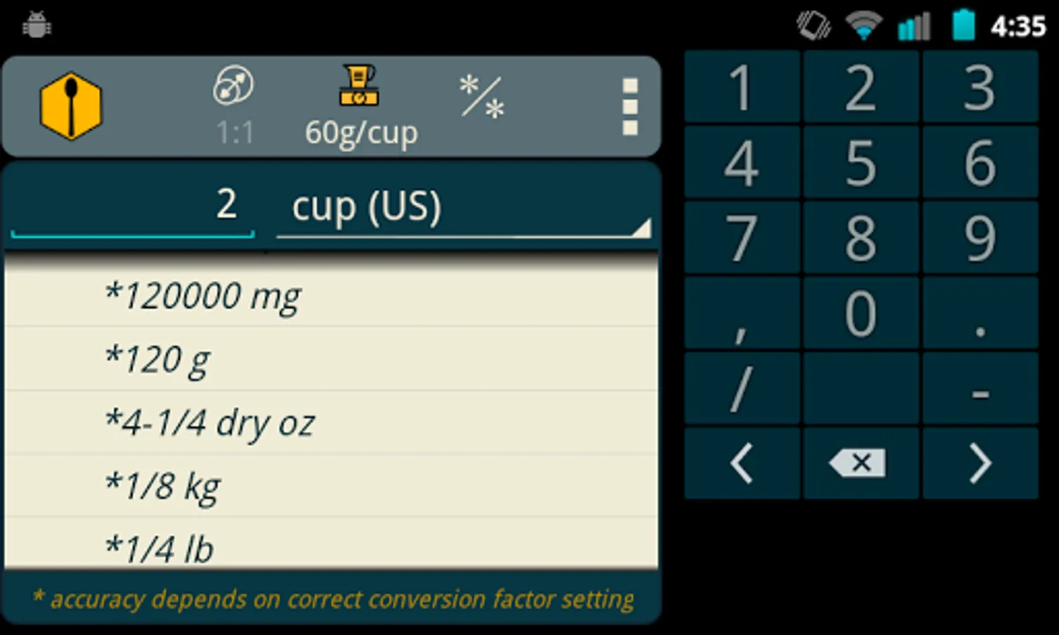 * Makes the coveted "grams to cups" conversion, as well as other weight/volume conversions, based on user-selectable weight factor parameter: includes common 180 quick-searchable ingredients with factors already figured.