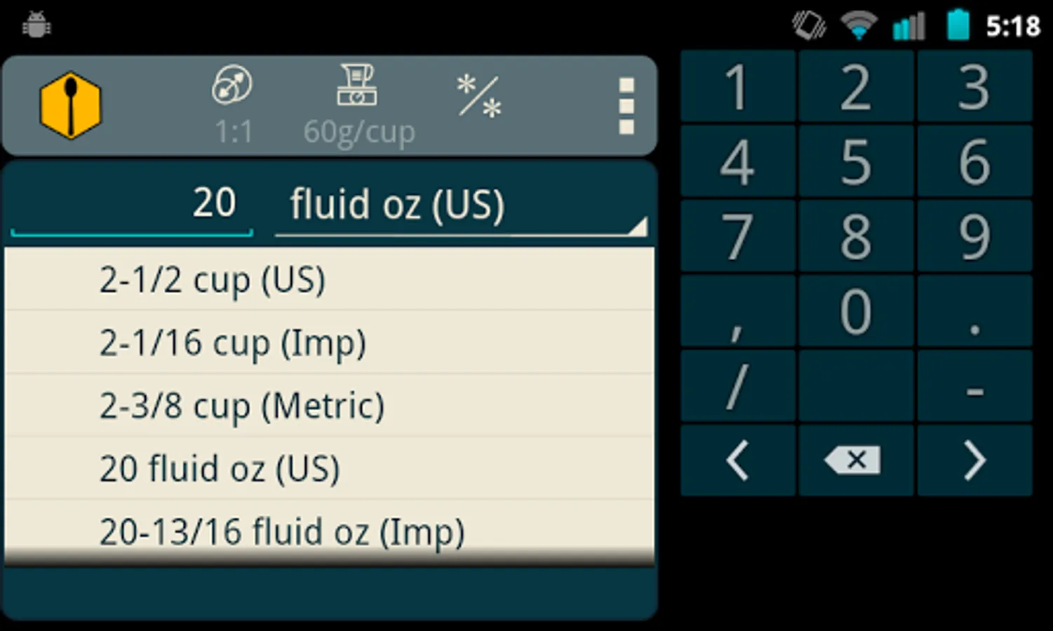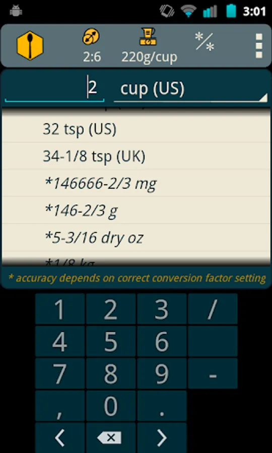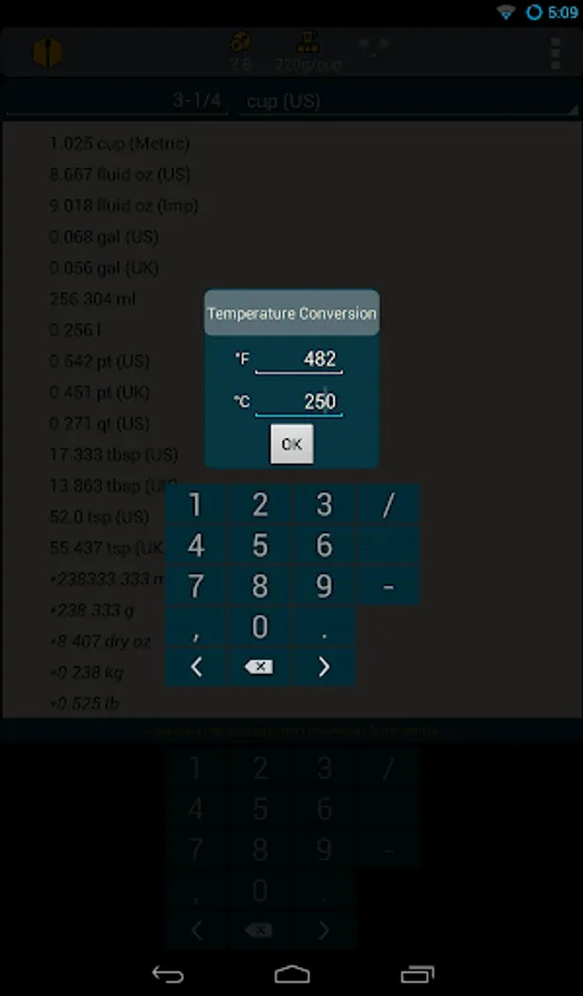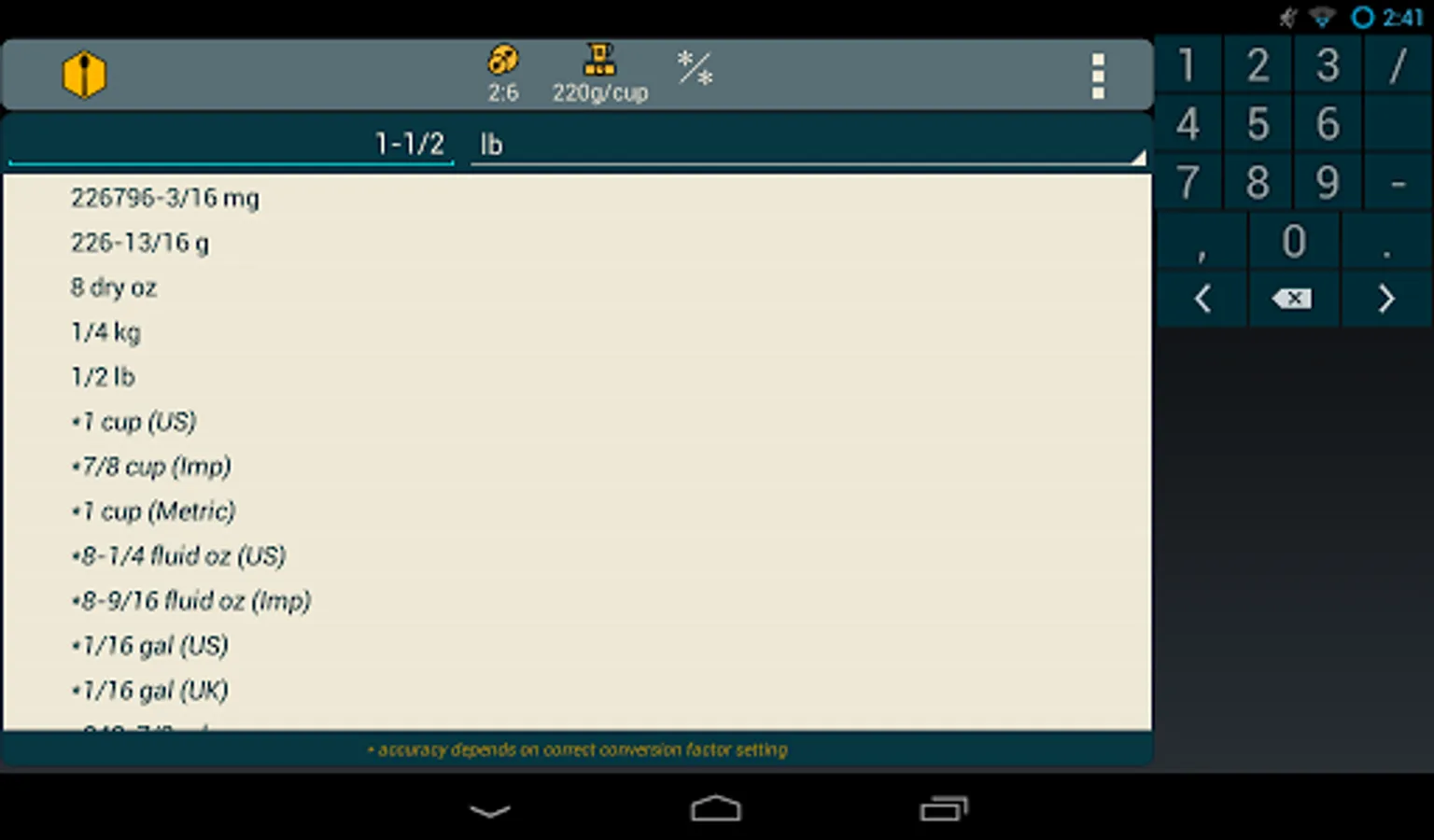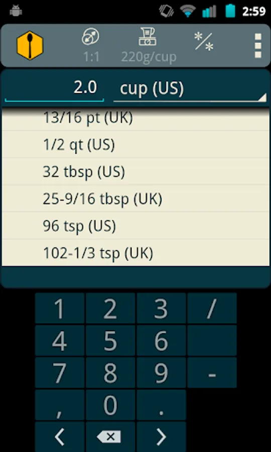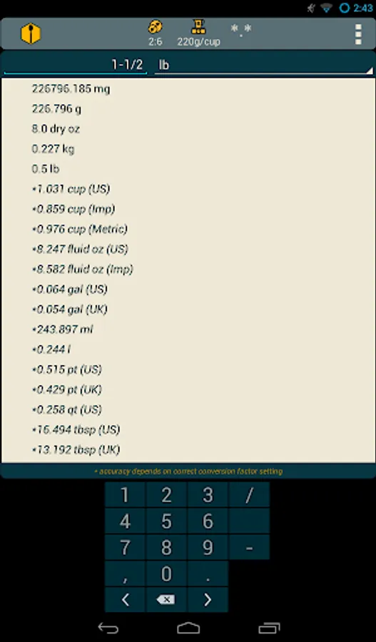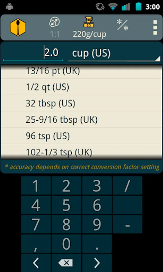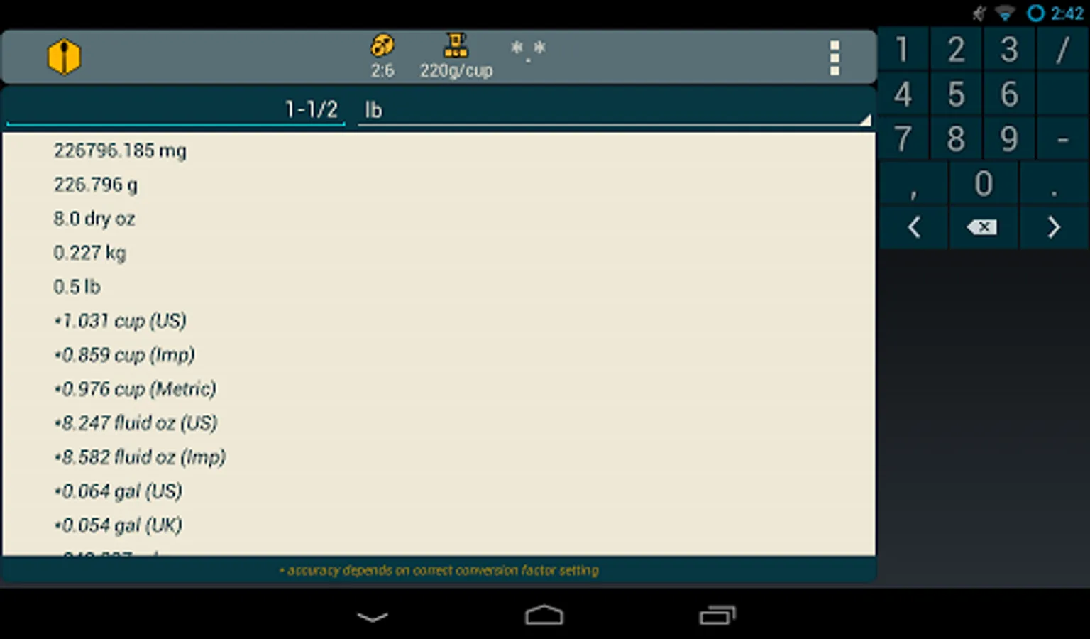 * Makes the coveted "grams to cups" conversion, as well as other weight/volume conversions, based on user-selectable weight factor parameter: includes common 180 quick-searchable ingredients with factors already figured.