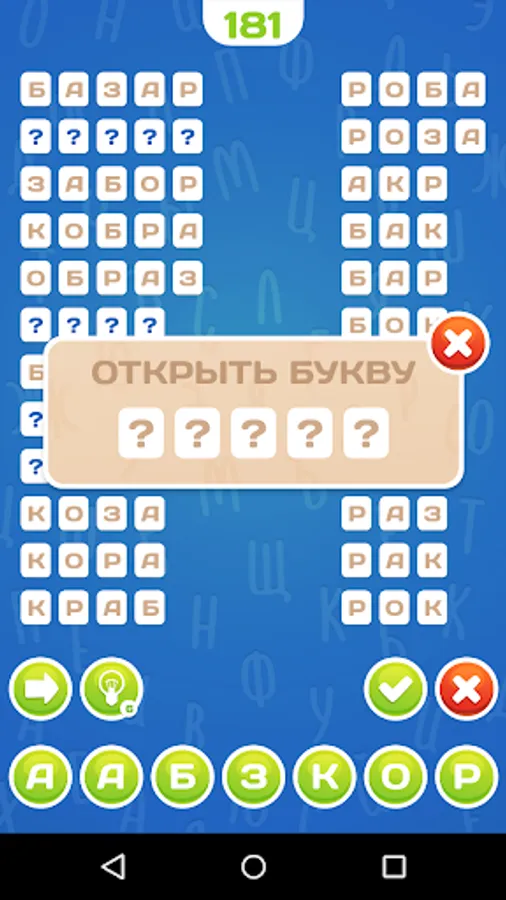This game provides a unique opportunity for interesting and useful for the mind to spend time making and guessing words. The game is available for passage of 96 levels with increasing difficulty. To go to the next level you have to guess a certain number of words. If you have problems and you can not guess any word, you can use the tips. For the player to guess the word are given awards, there is also a table of records. If you guessed the word which is not among the levels of the hidden words, then charged him twice more points.