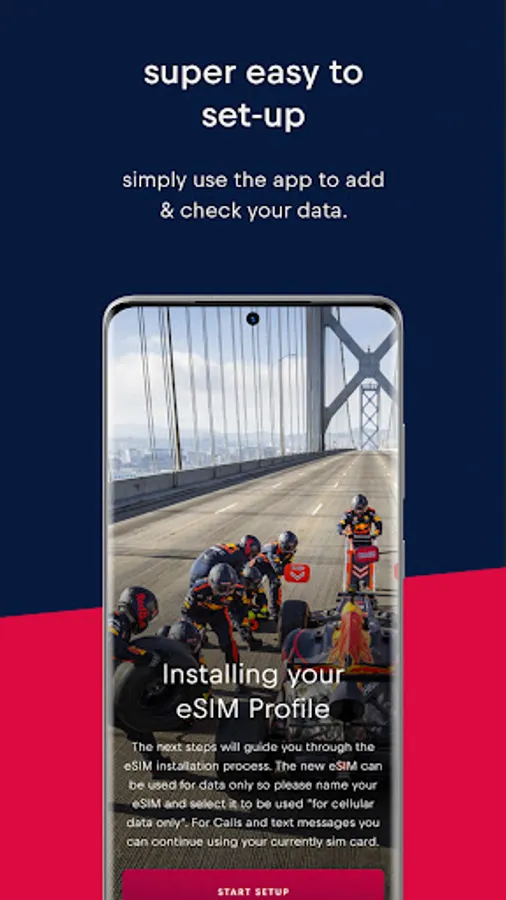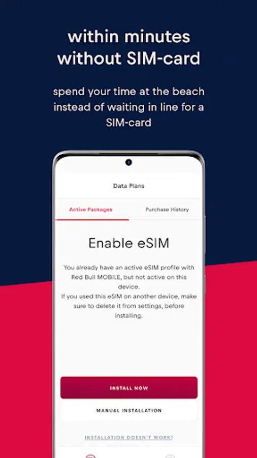 The easy way to buy international data at a super fair price! Without obligations, no additional subscription, no strings attached. Get a data bundle to use abroad - no surprise of an outrageous bill once you are back home. All you have to do is to download the App. The Red Bull MOBILE Data App provides your data plan that does NOT require a physical SIM card!