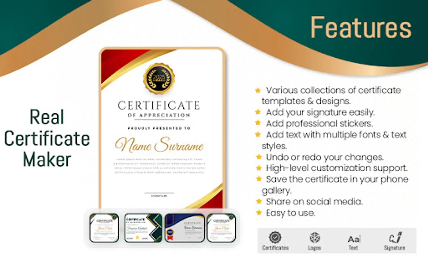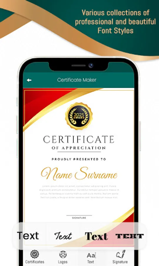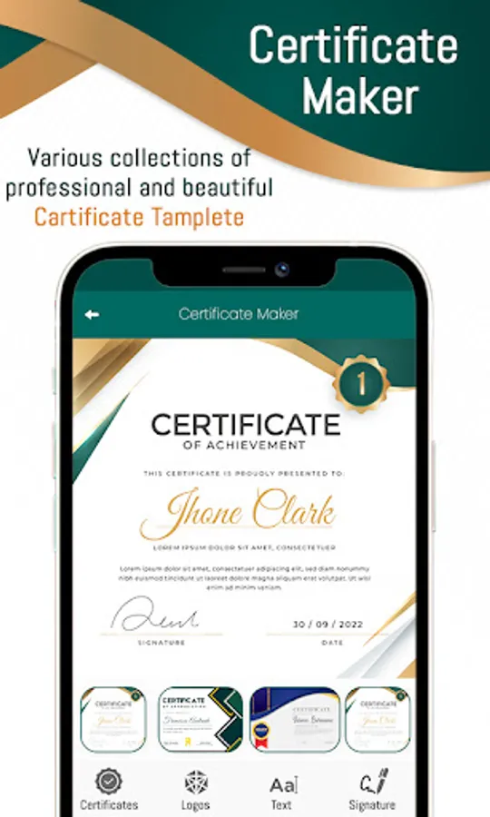The certificate maker contains different types of certificate temples which include award certificates and has lots of textual styles with the help of which you can put some text in your certificate. Certificate Maker Pro app comes with beautiful content to use without charge!