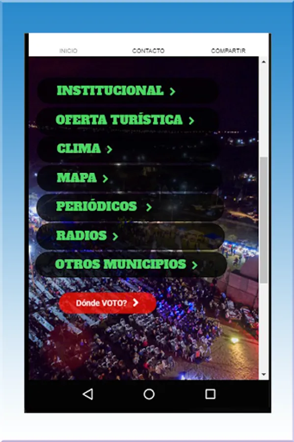- Access vital information from all locations connected to the network, it enables you to know the weather, your extended forecast;. and common satellite map of the area or region and all locations connected to the network; Multimedia gallery with pictures and videos of regional and tourist interest; tourist offer of the town and all municipalities and communes attached to the network.