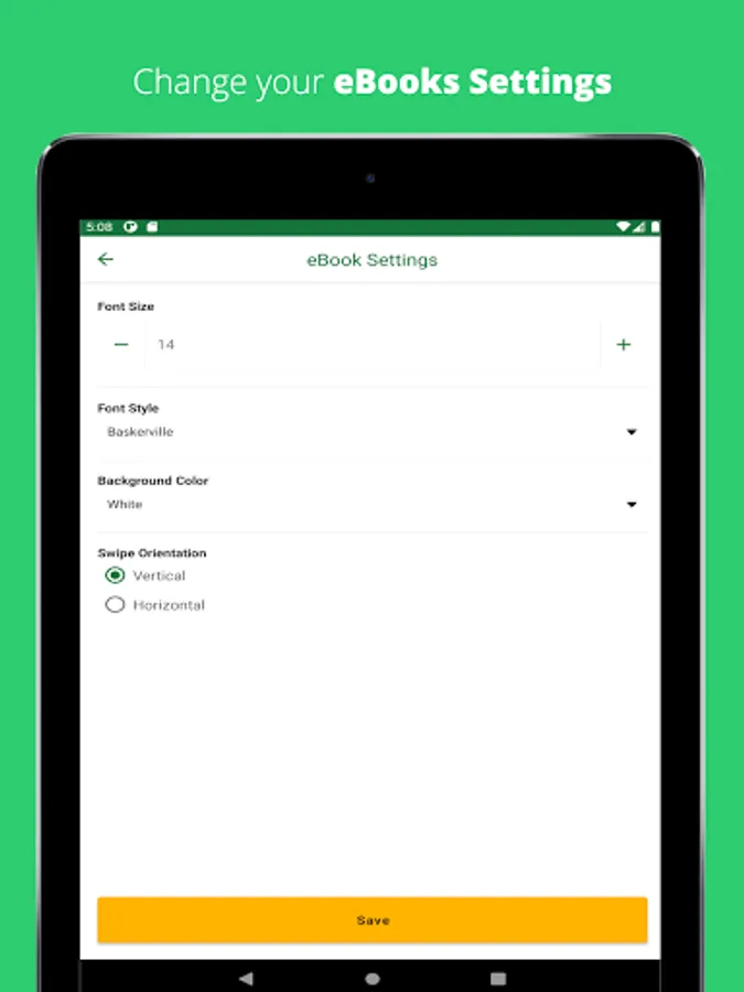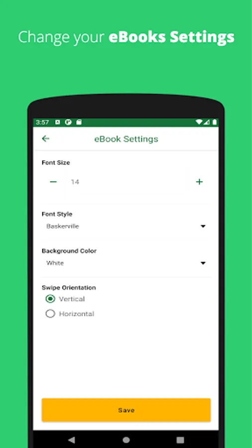 - Customize your font type, orientation (portrait or landscape) and Profile settings on eBooks