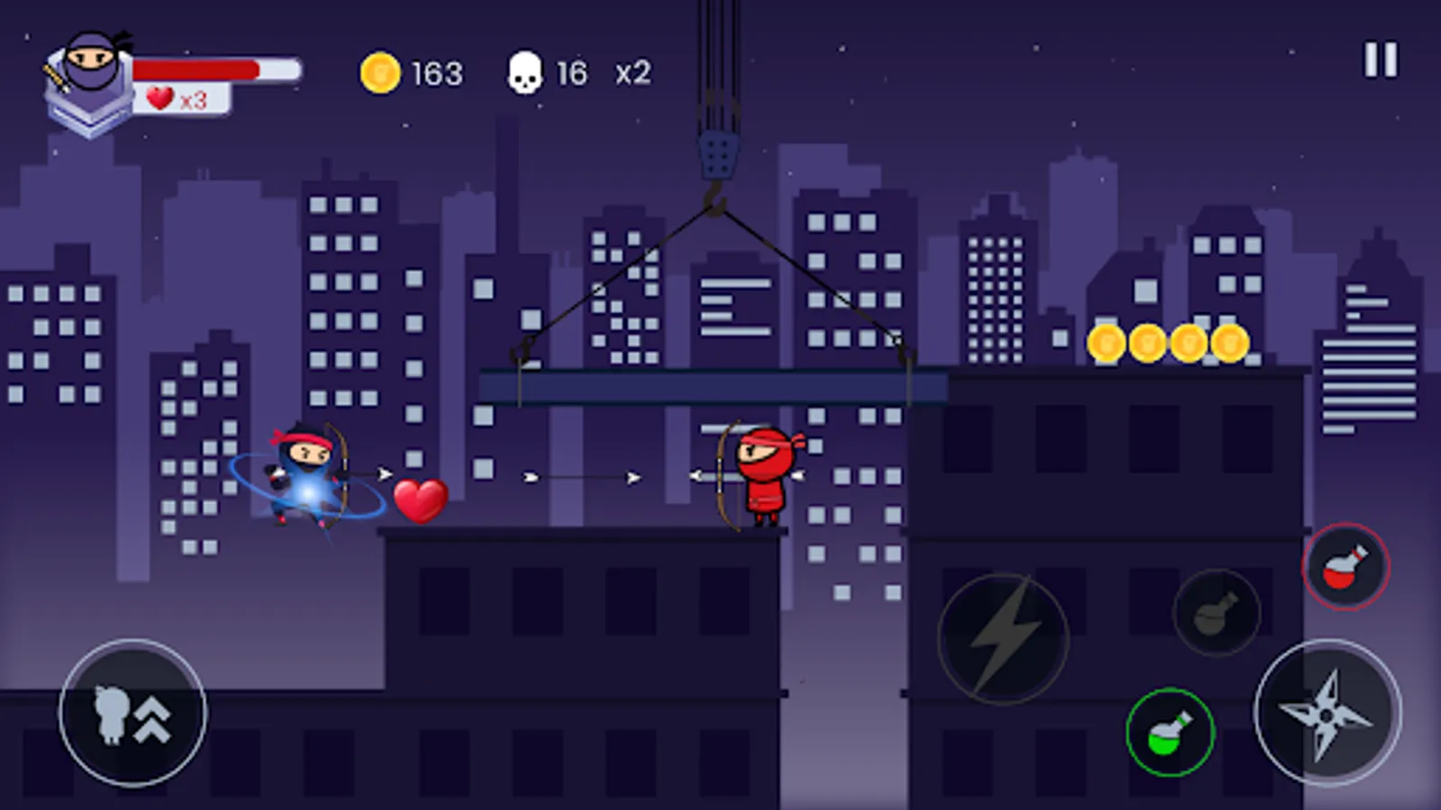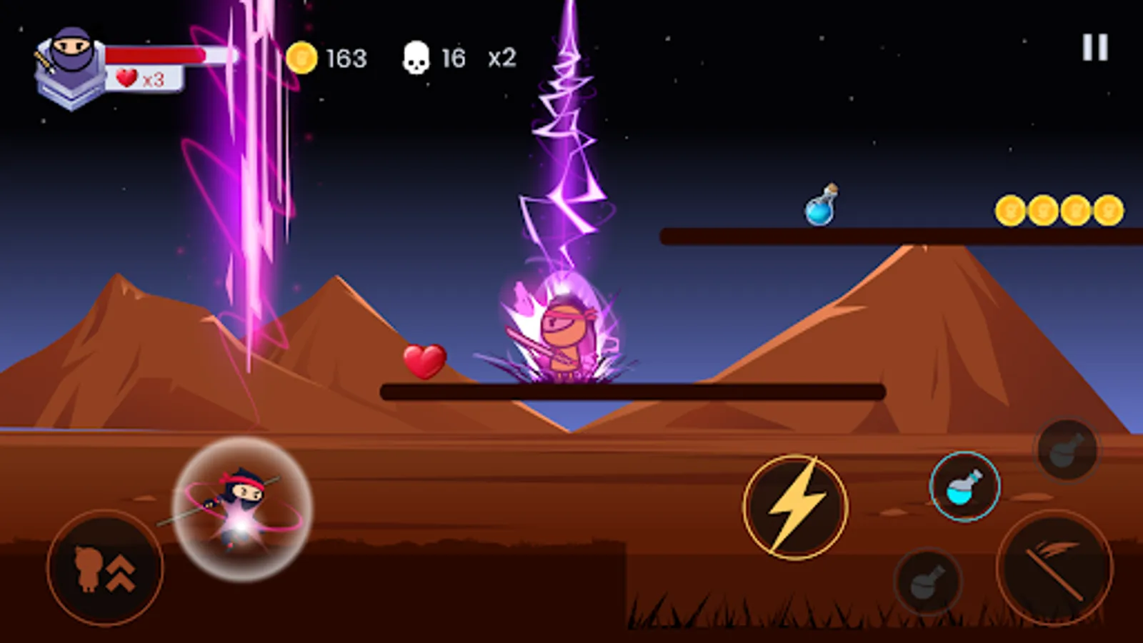 💢 Control the ninja warrior to jump high or slide on the platforms.
