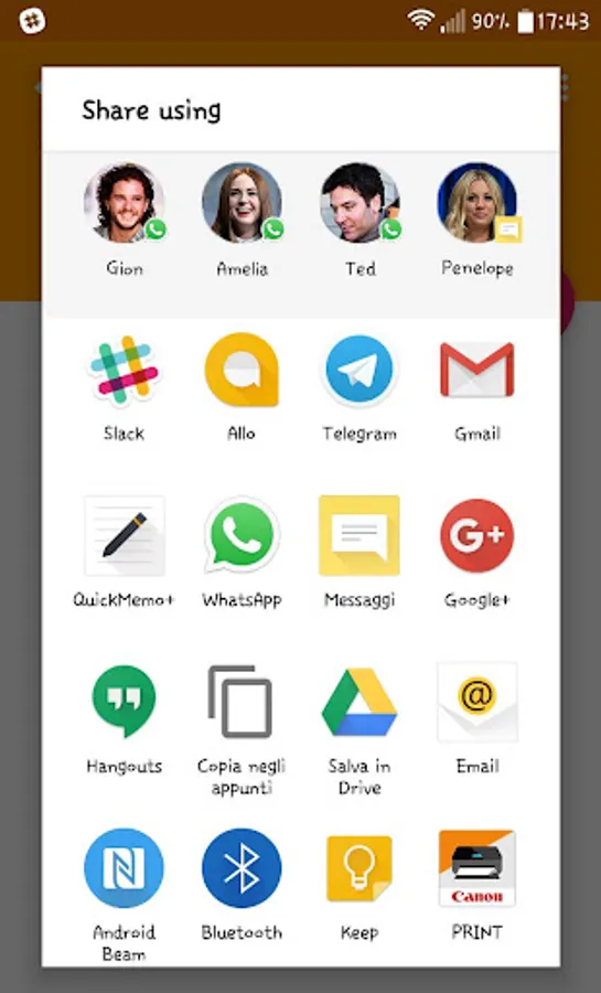 You'll just have to send the card you want to share through your favorite instant messaging app (Whatsapp, Telegram, Messenger, Email, Sms and much more) and the recipient will have it at her disposal on her phone.