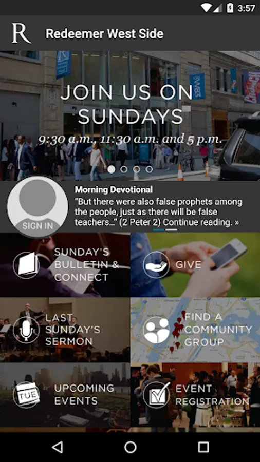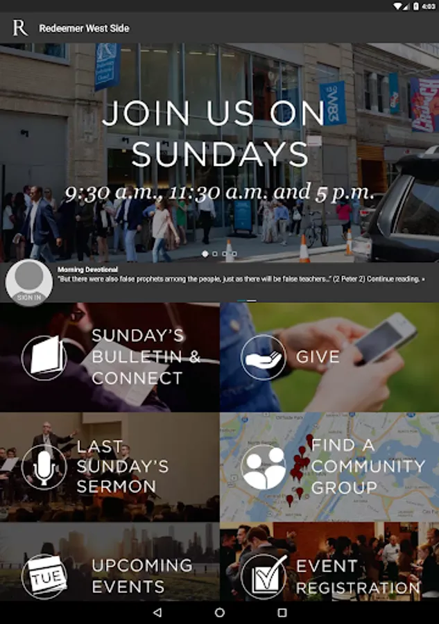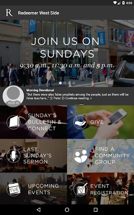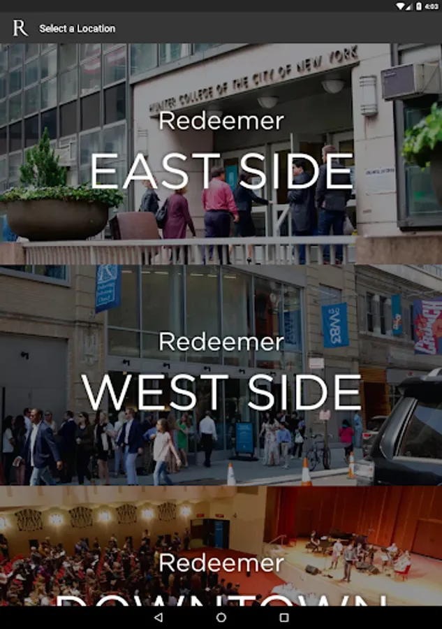 This app is a great way to get connected to your Redeemer church (East Side, West Side, Downtown or Lincoln Square).