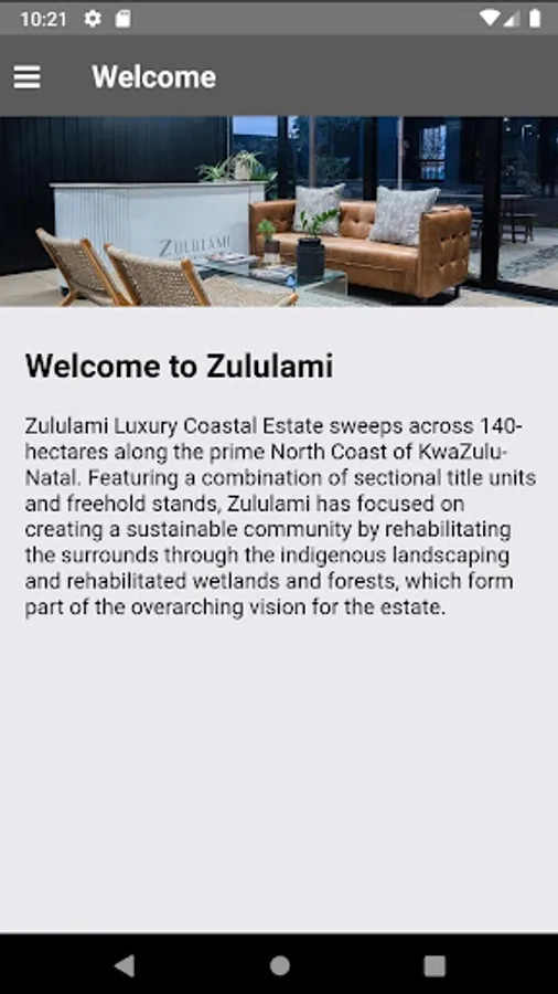 Zululami Resident's App for generation of access codes and access to estate news broadcasts.
