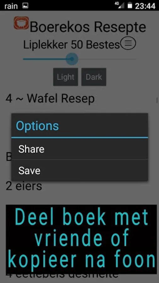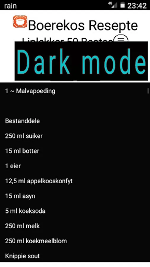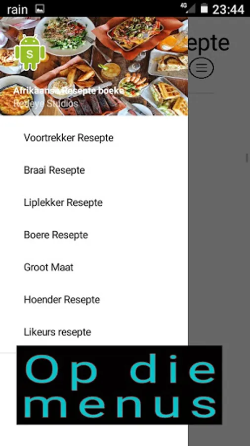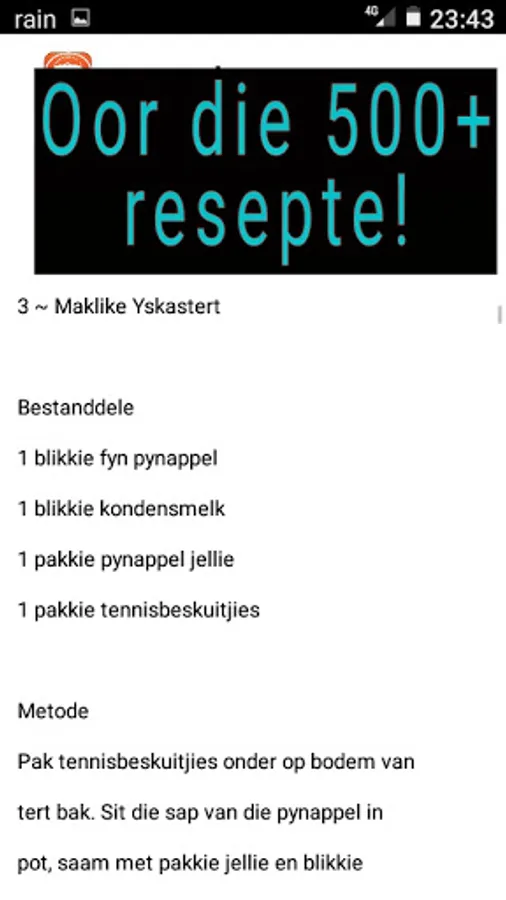 Within the application is a collection of Boerekos Recipes books with over 500 Recipes in Afrikaans