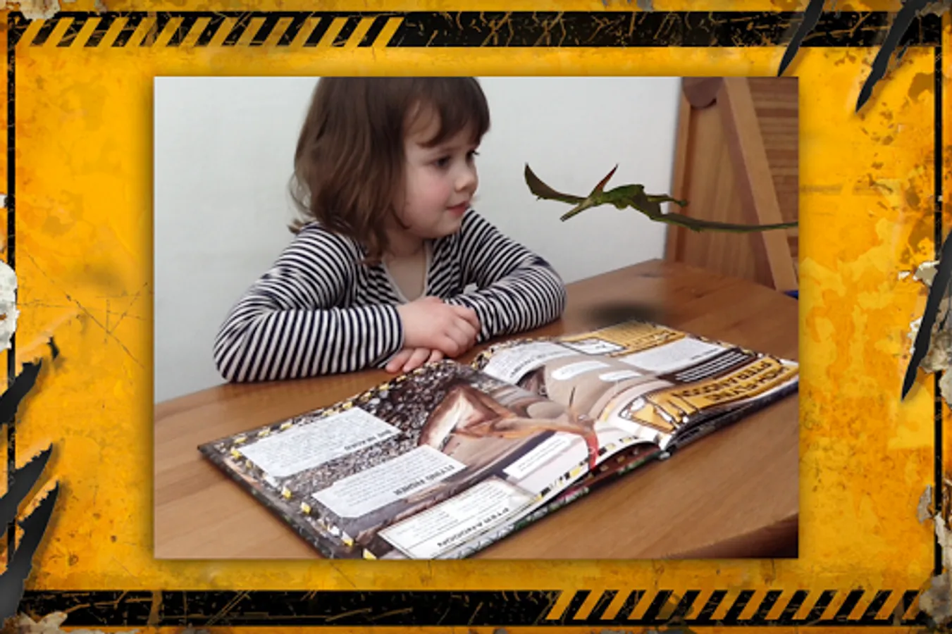 To see the dinosaur animations in action, find one of the yellow Augmented Reality boxes in your iDinosaur book. Then launch the app, point your device’s camera at the book while it is open flat on the floor or a table and watch your dinosaurs spring roaring to life!