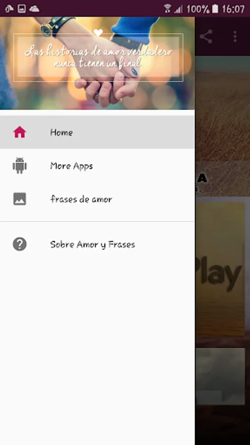 In Love and Phrases App, you will find beautiful verses, the best quotes in pictures for love, friendship or for life, hope they are useful to face your day with a smile. You can use these phrases to whatsapp, facebook or social network you prefer. Who does not like receiving messages of love, friendship or positive for life, animase and share these words of love and beautiful verses in pictures to loved ones, friends and the person he loves.