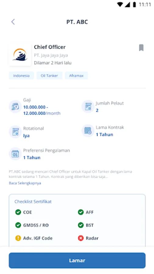 The Redikru application makes it easy for prospective crew members to connect with the leading maritime companies in Indonesia. Build and develop your professional profile, store all your certificates in one place and apply for jobs faster.