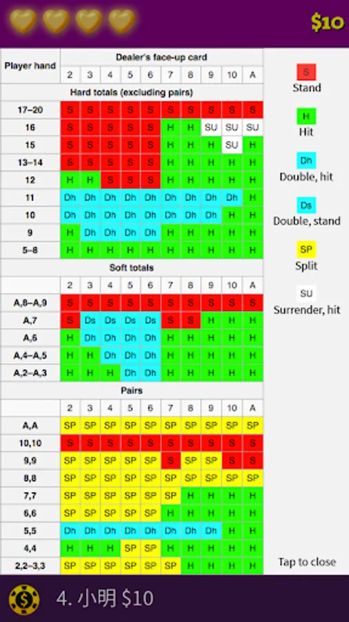 Blackjack BS is a game as well as a tool that it helps you mastering basic strategy. Basic strategy is a result of probability and computer simulation. It gives you the best move (Hit, Stand, Double, Split or Surrender) to increase your chances of winning on blackjack tables. Don’t want be an idiot anymore when facing the blackjack dealer, start practicing now. Like other skills, the more you play, the better you get. Good luck and enjoy you blackjack journey.