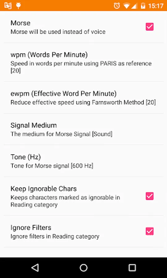 -Morse Code by sound (400Hz - 1000Hz) or vibration.