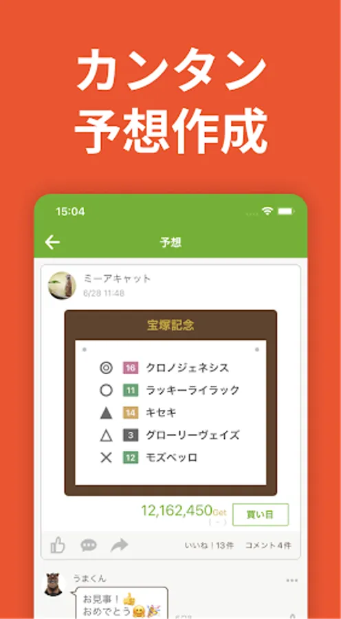 Users who like horse racing gather from all over the country. You can get likes for your predictions, talk with them, and increase your connections.