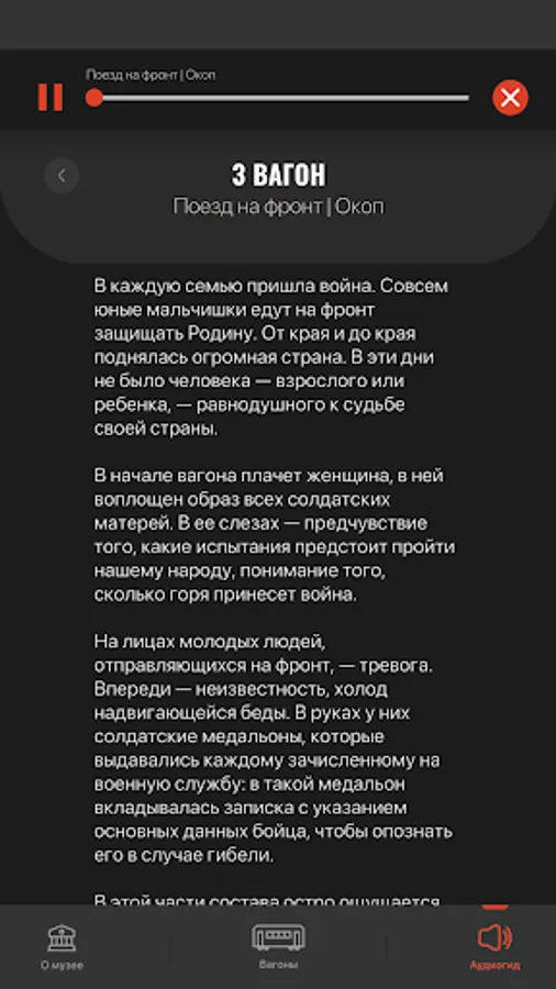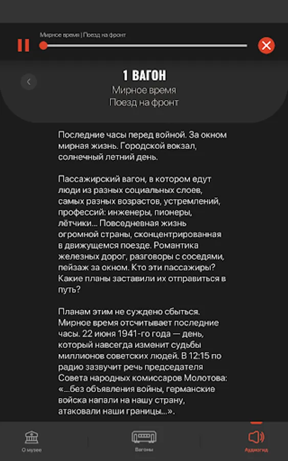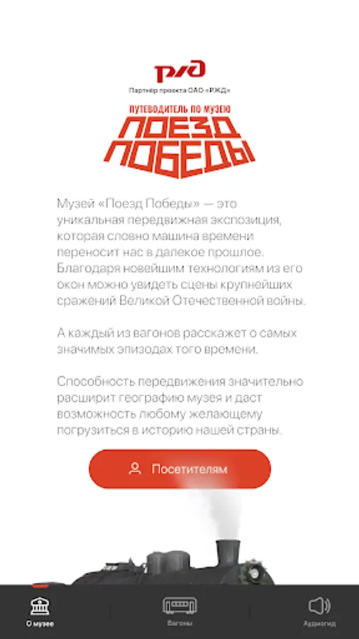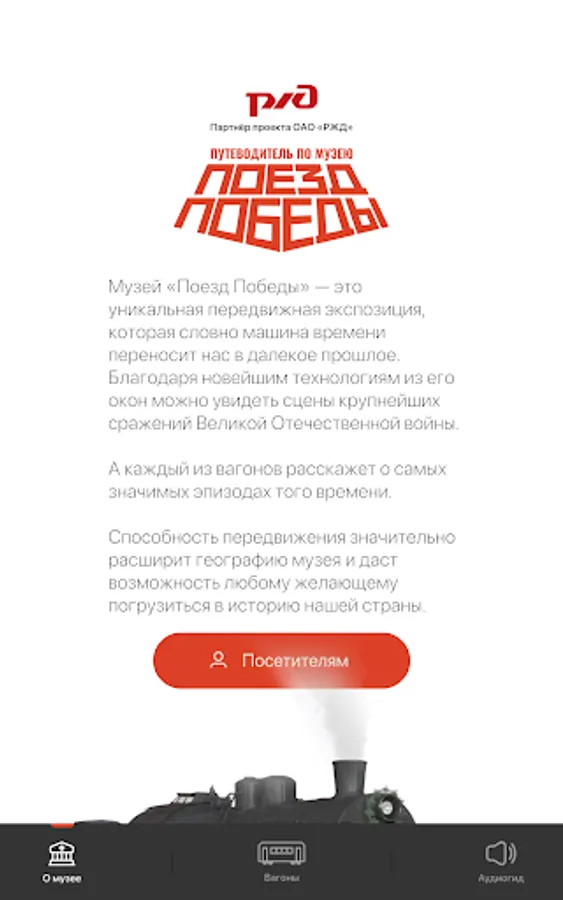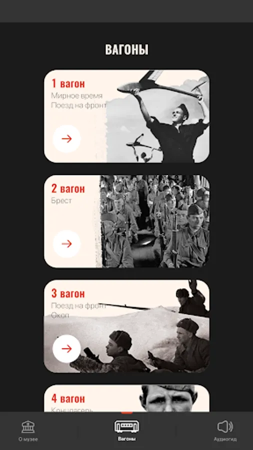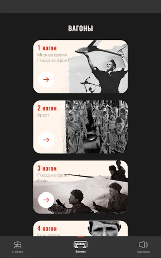 Seven cars of our train will tell about the tragic events of the Great Patriotic War and human exploits. Use the app as a navigator for a unique traveling history and art exhibition.