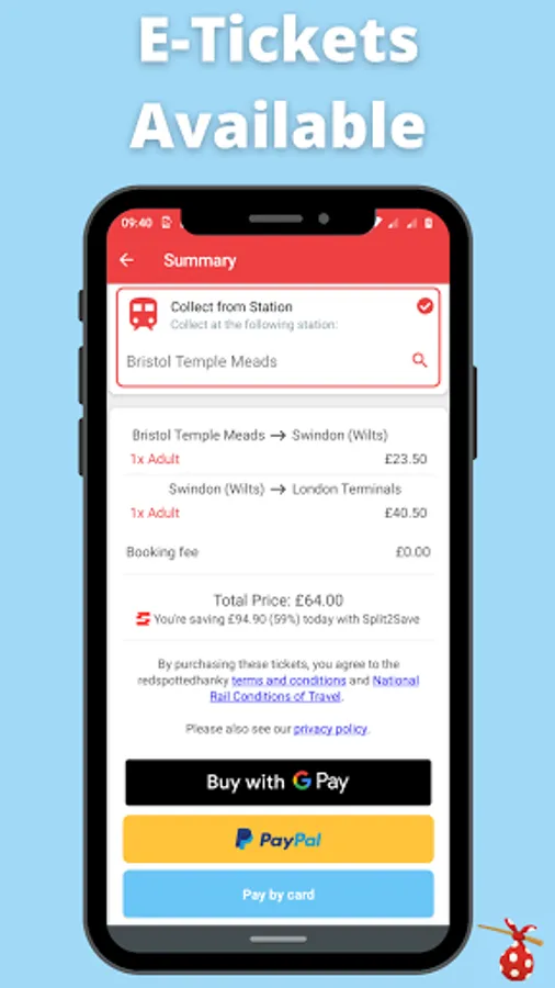 It couldn’t be easier; check the train times, select the best ticket option for you (ssssshhhh don’t tell anyone, but booking through redspottedhanky.com can save you up to 61%). Pay using Apple Pay or PayPal. All major credit and debit cards are accepted too. Your tickets will be available in your wallet within minutes.