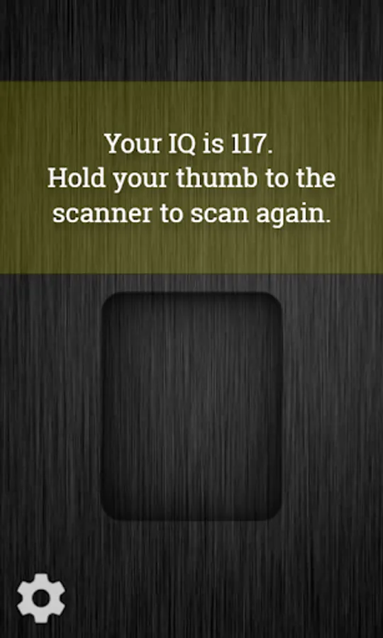 IQ Scanner is a free novelty fingerprint scanner app that pretends to check your IQ using a mock fingerprint scan! Simply place your thumb on the scanner, wait a moment, and then the app will tell you a random number.