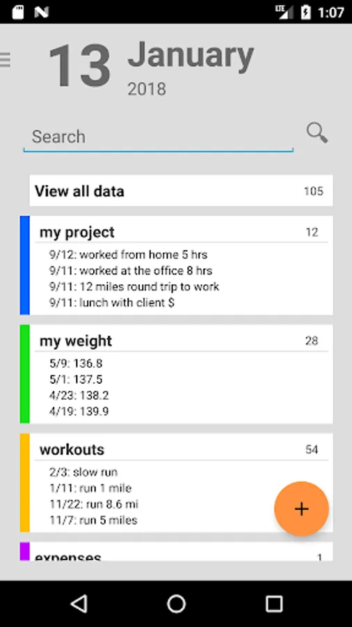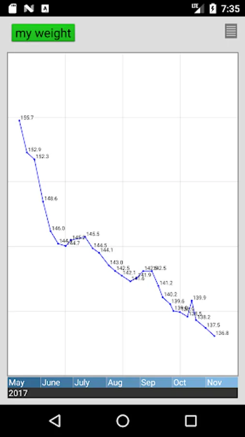 Track your weight (or any other numeric data) and view it on a graph over time. Keep Track doesn't restrict you to entering number-only data. As long as you put the number first (ex: '146.2 lbs'), it will graph it.