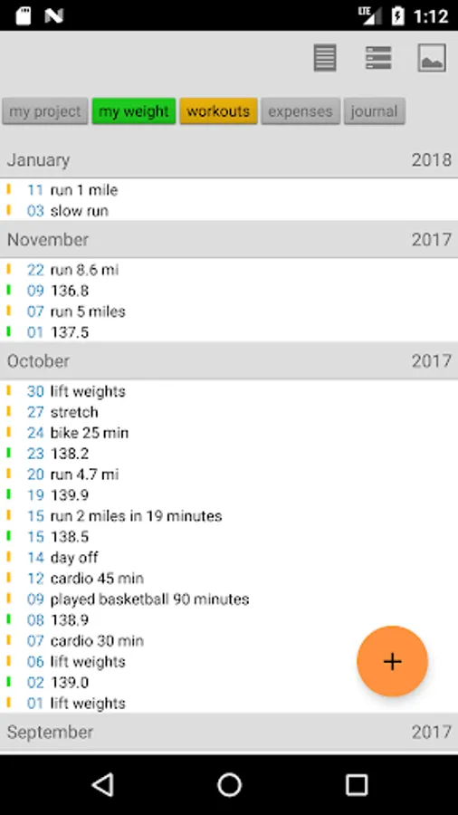 Keep Track Notebook is a workout log, activity tracker, an event tracker, a data tracker, a life tracker, a journal, and a notebook. Keep track of anything that happens on a daily, weekly, or monthly basis.... like your workouts, your weight, your eating habits, your kids sports scores, hours worked, business expenses, and miles traveled. Just make your own custom label for anything you want and start tracking your data.
