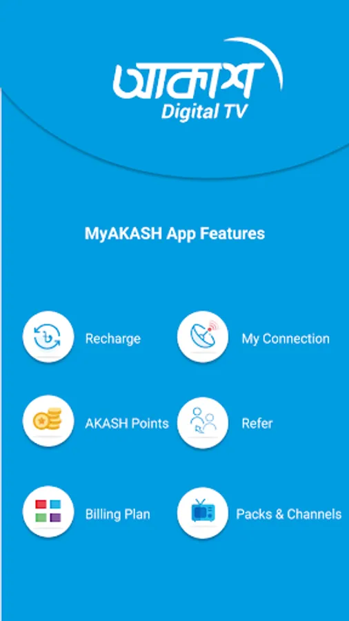 MyAKASH is a self-service app of AKASH Digital TV which consists of Convenient selfcare features that enables Recharge, Billing Plan Change, Migrating to and from packages, Customer Care Live Chat, Service Request and more in a single App.
