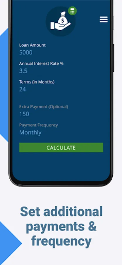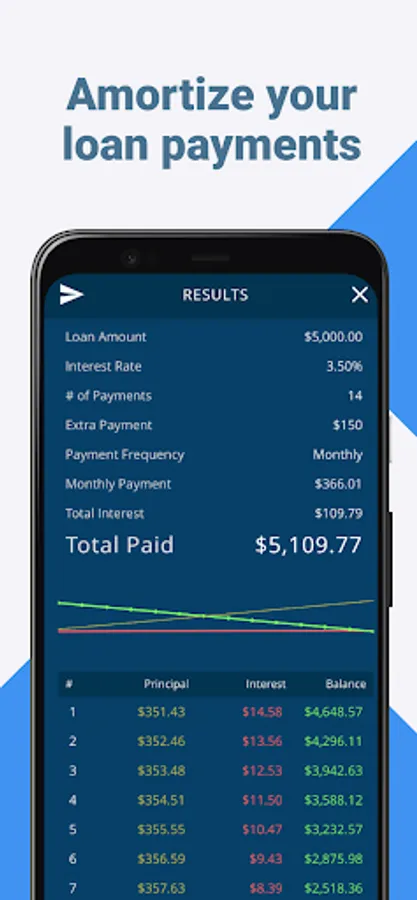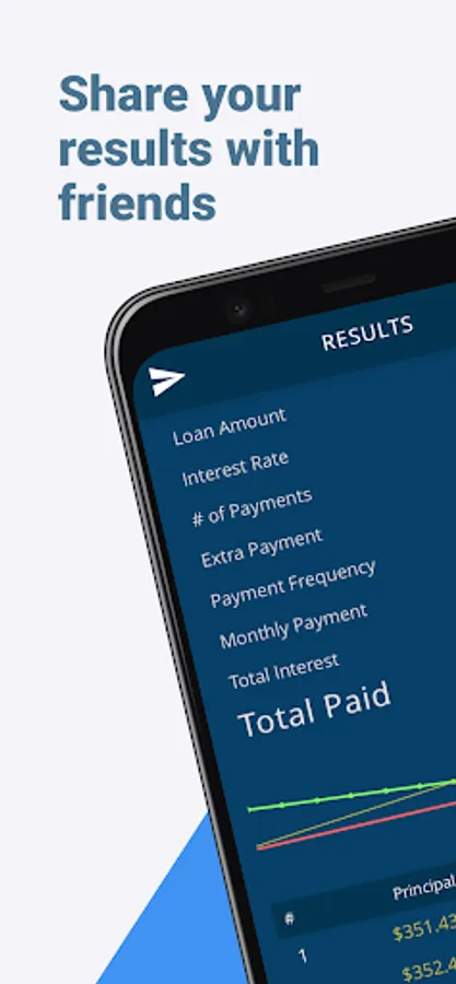 Set the loan amount, interest rate, terms, extra payments (optional), and payment frequency (set monthly by default), then tap on “calculate” and get the monthly payment, total interest paid, total paid with interests, and the amortization schedule. You can then share the loan terms via email, SMS, or your preferred social network with family and friends.