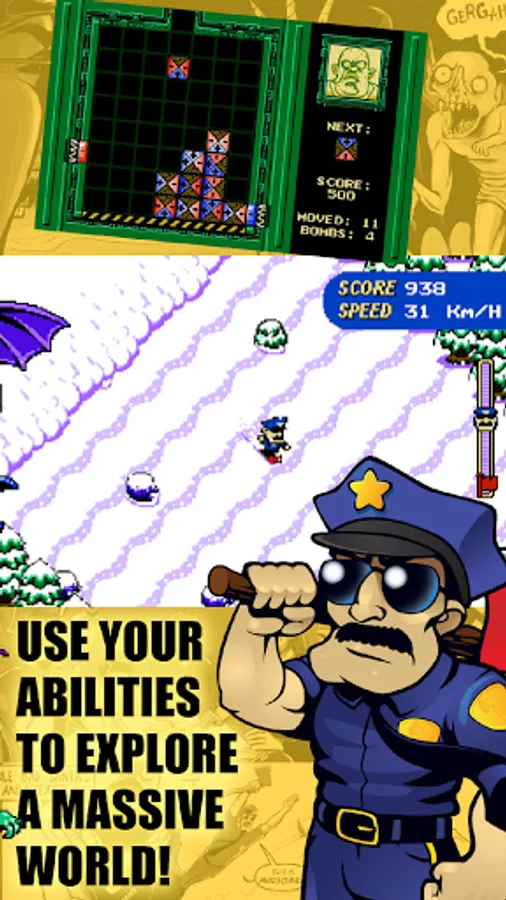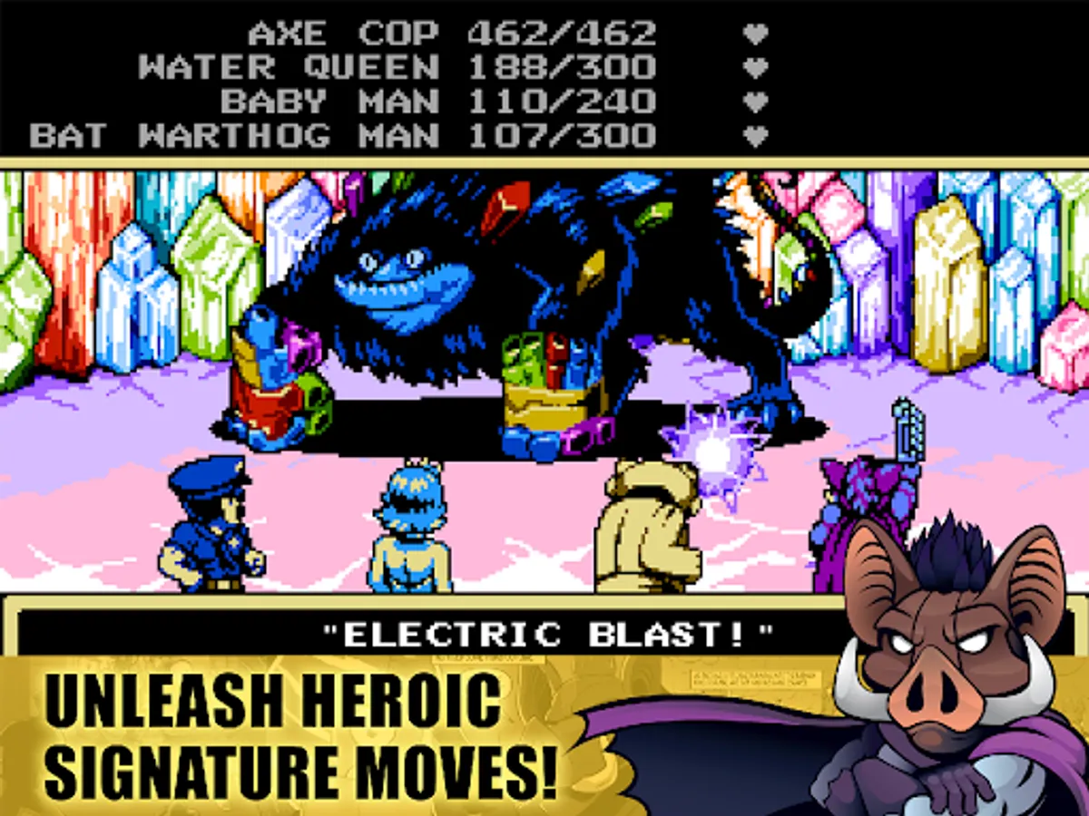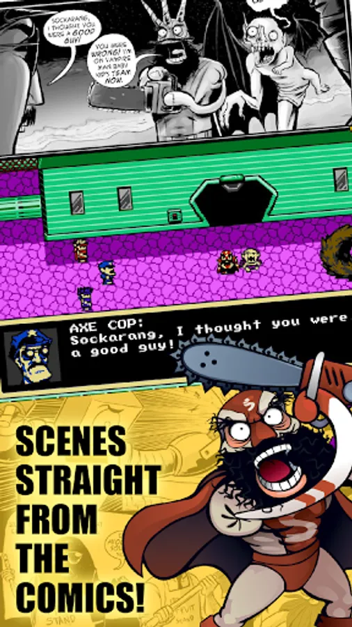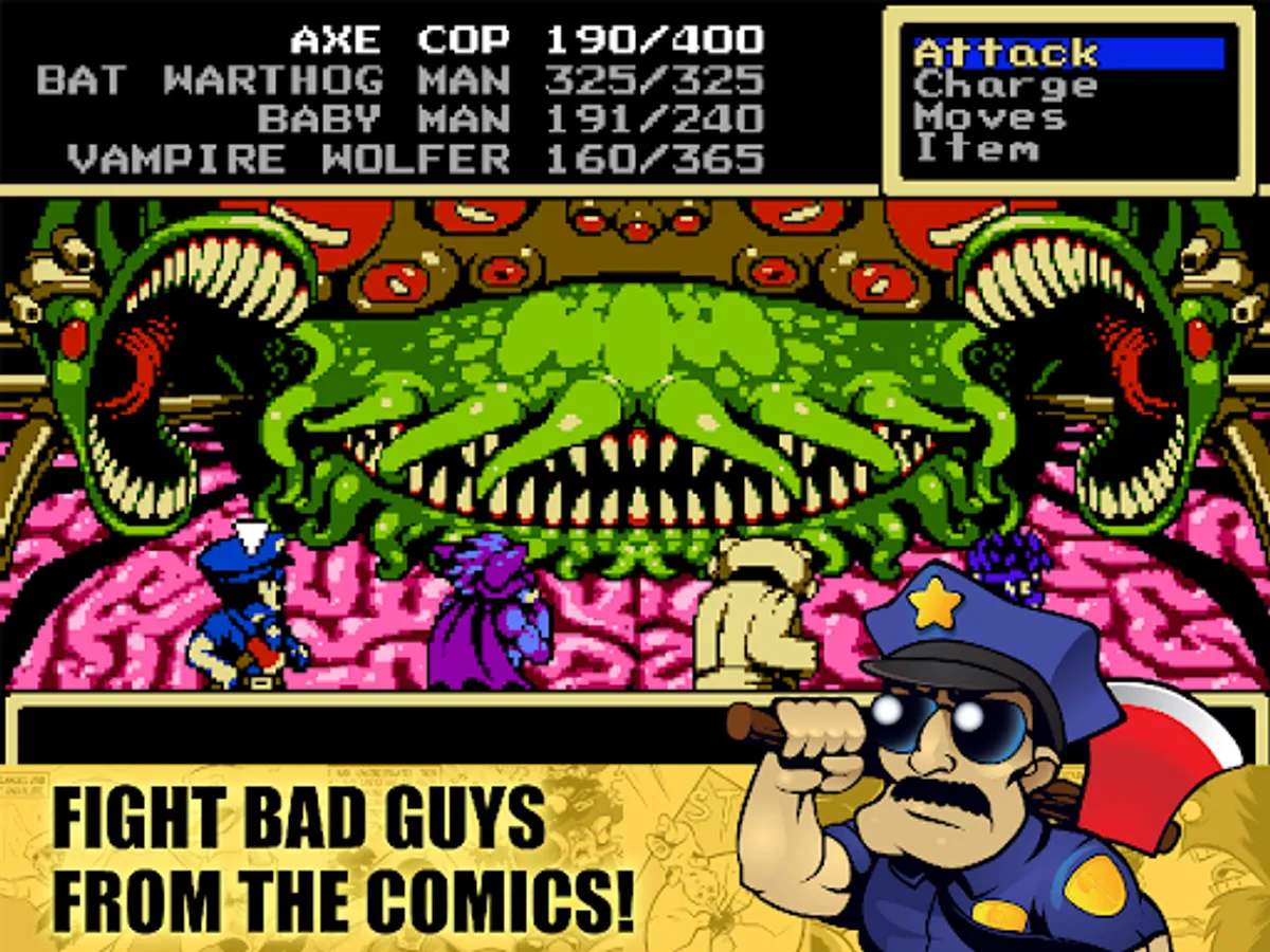 Play as Axe Cop and his team in this classic retro RPG! Take on challenging missions against his most devious enemies such as Bad Santa Claus, Dr. Stinkyhead, Dr. Doo doo and more! The Axe Cop Game is great for casual and hardcore RPG gamers alike, offering plenty of strategy, quests and story for any gamer to sink their axe into!