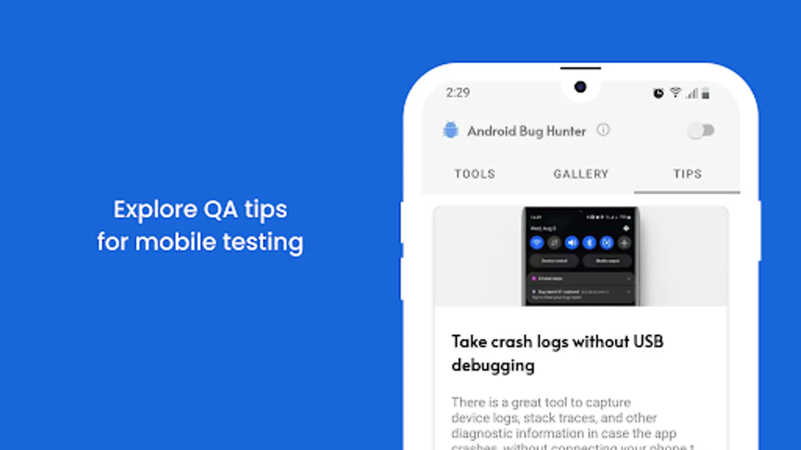 Android Bug Hunter is an ultimate manual app testing tool, designed to help QA engineers, UI/UX designers, and software developers effectively deliver product updates.