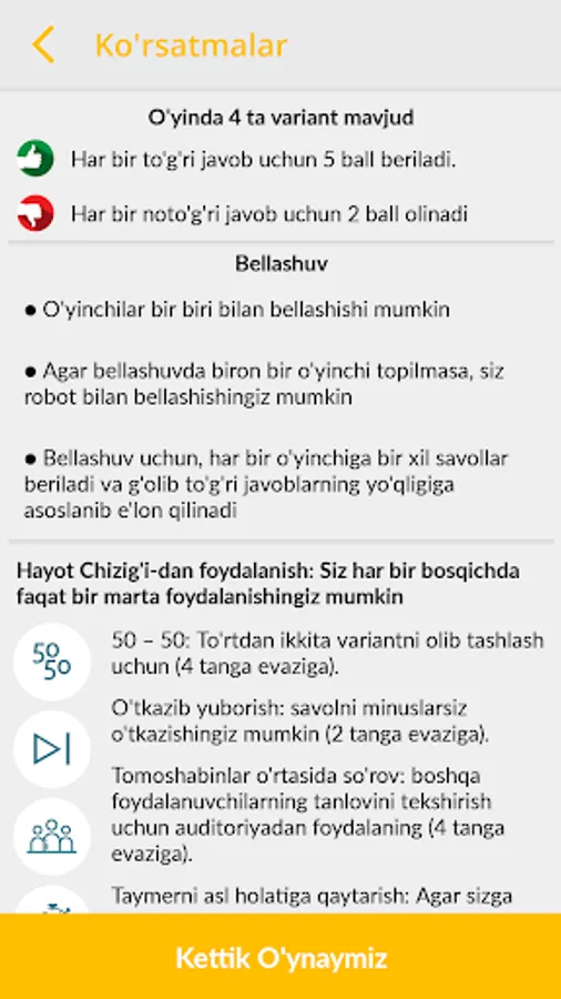 Online Savollarga Javob Berish Tangalar Ishlab Topishingiz va Ularni Haqiqiy Pulga Aylantirishingiz mumkin. Testlar oddiy ko'rinishda bo'lib ham o'yin ham aqlni charxlash sifatida foydalanishingiz mumkin. Dasturda Butun O'zbekiston bilan bellashishingiz mumkin. G'oliblar doimiy tarzda taqdirlanib borishadi.