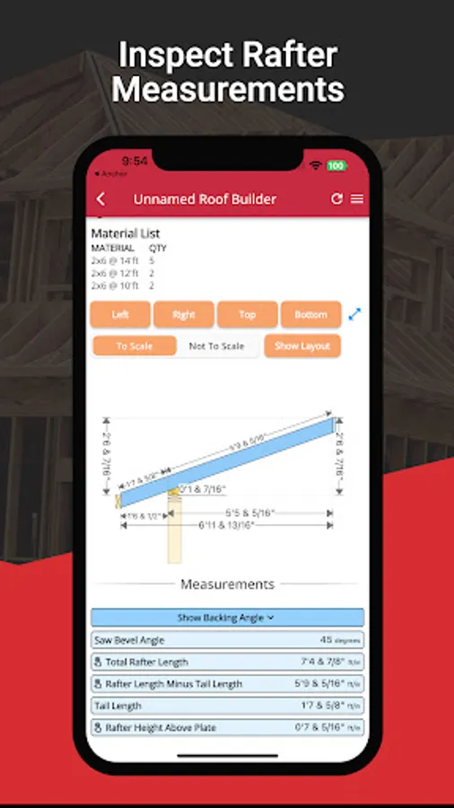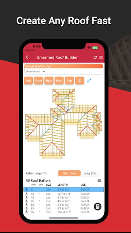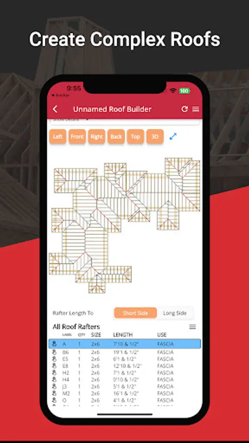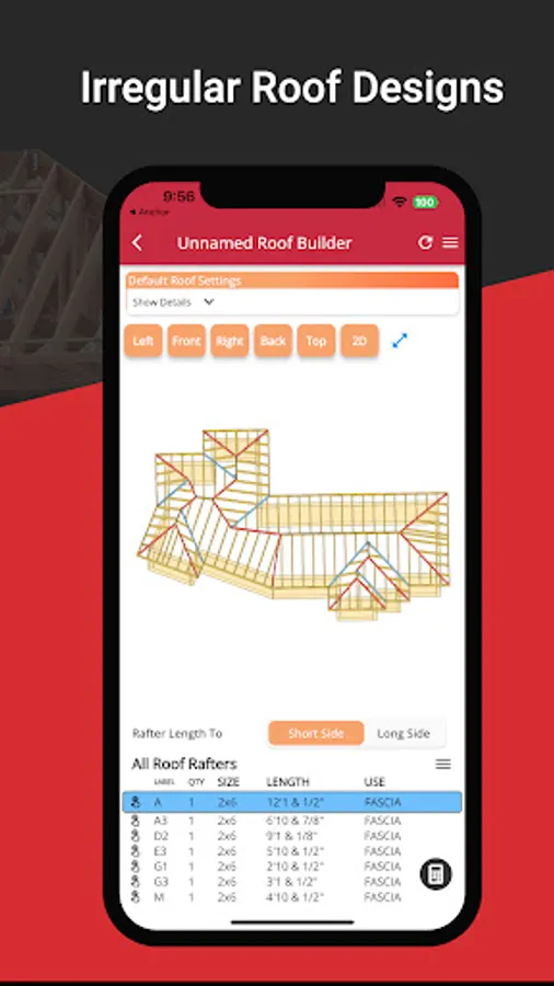 Tap on any roof side to access a multitude of features, like examining Roof Side Area and Measurements, reviewing specific Rafter Measurements, and checking Saw Bevel Angles. RedX Roof Builder also provides detailed roof measurement reports, including Total Roof Area and Linear Feet Measurements for Common, Hip, Valley, and Ridge Rafters.